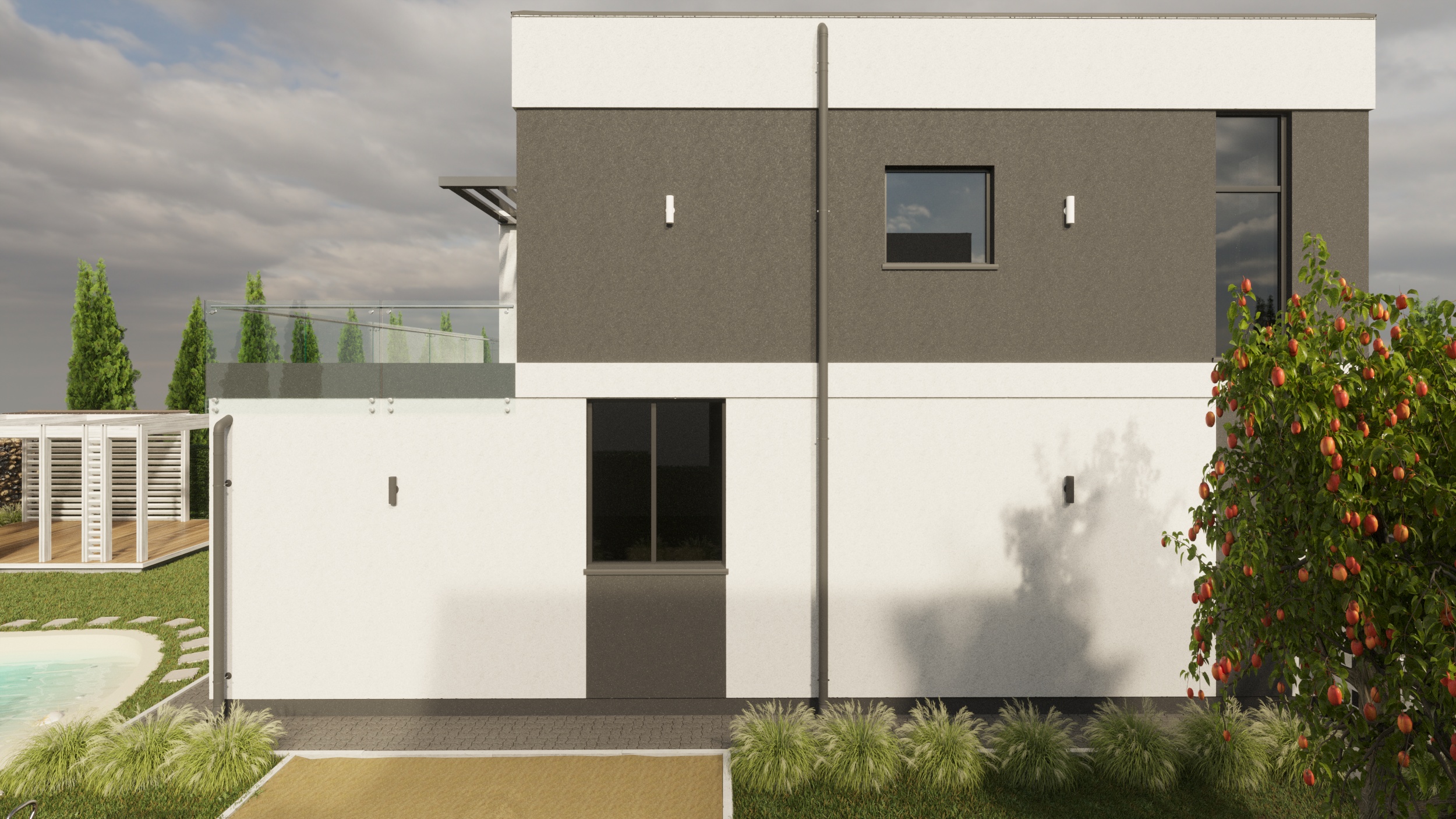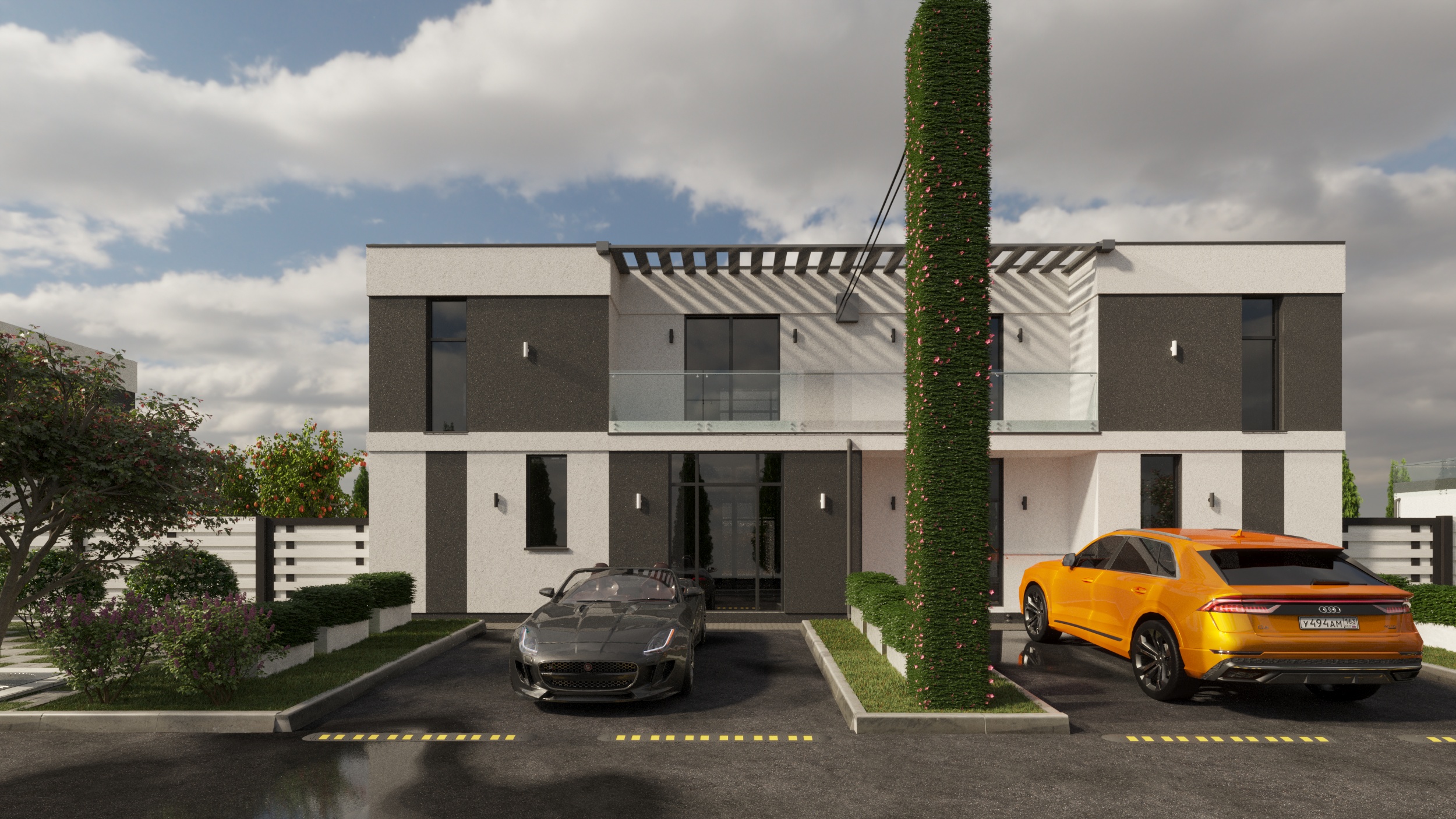 На эскизе должны быть прорисованы входные двери, окна, парковка, пешеходные дорожки, столбы