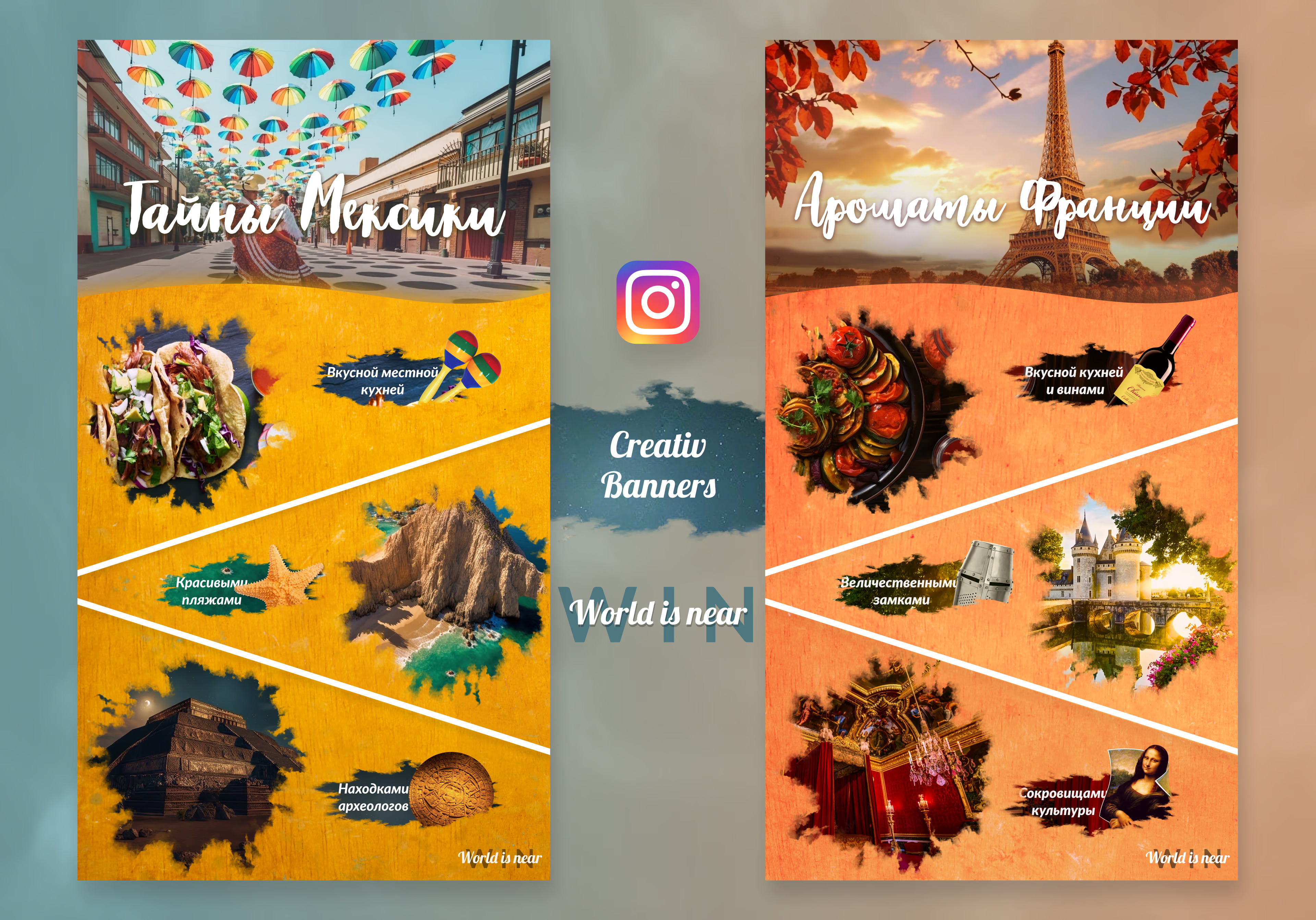 Виконане завдання — створити яскраві та виразні банери, що передають атмосферу і красу кожної країни. Основний акцент був на візуальній подачі — через кольори, композицію та деталі передати настрій і характер місця.