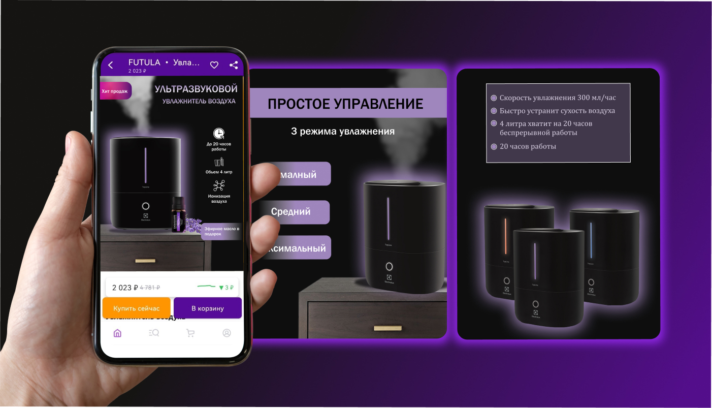Яркое и стильное оформление карточки, поможет вам выделится, показать все достоинства товара, и тем самым быстрее и выгоднее продать ваш товар.