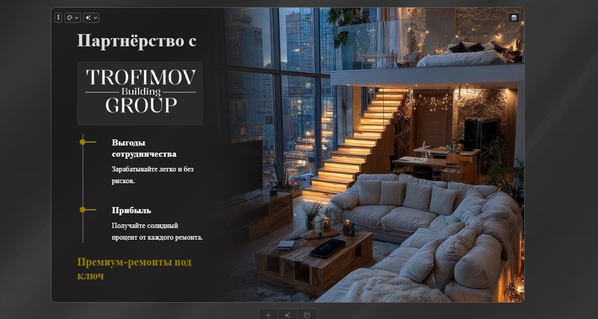 Опишите задачу — проведу короткое интервью и создам презентацию, которая поможет бизнесу выделиться, заключить партнёрства, привлечь клиентов и увеличить продажи.