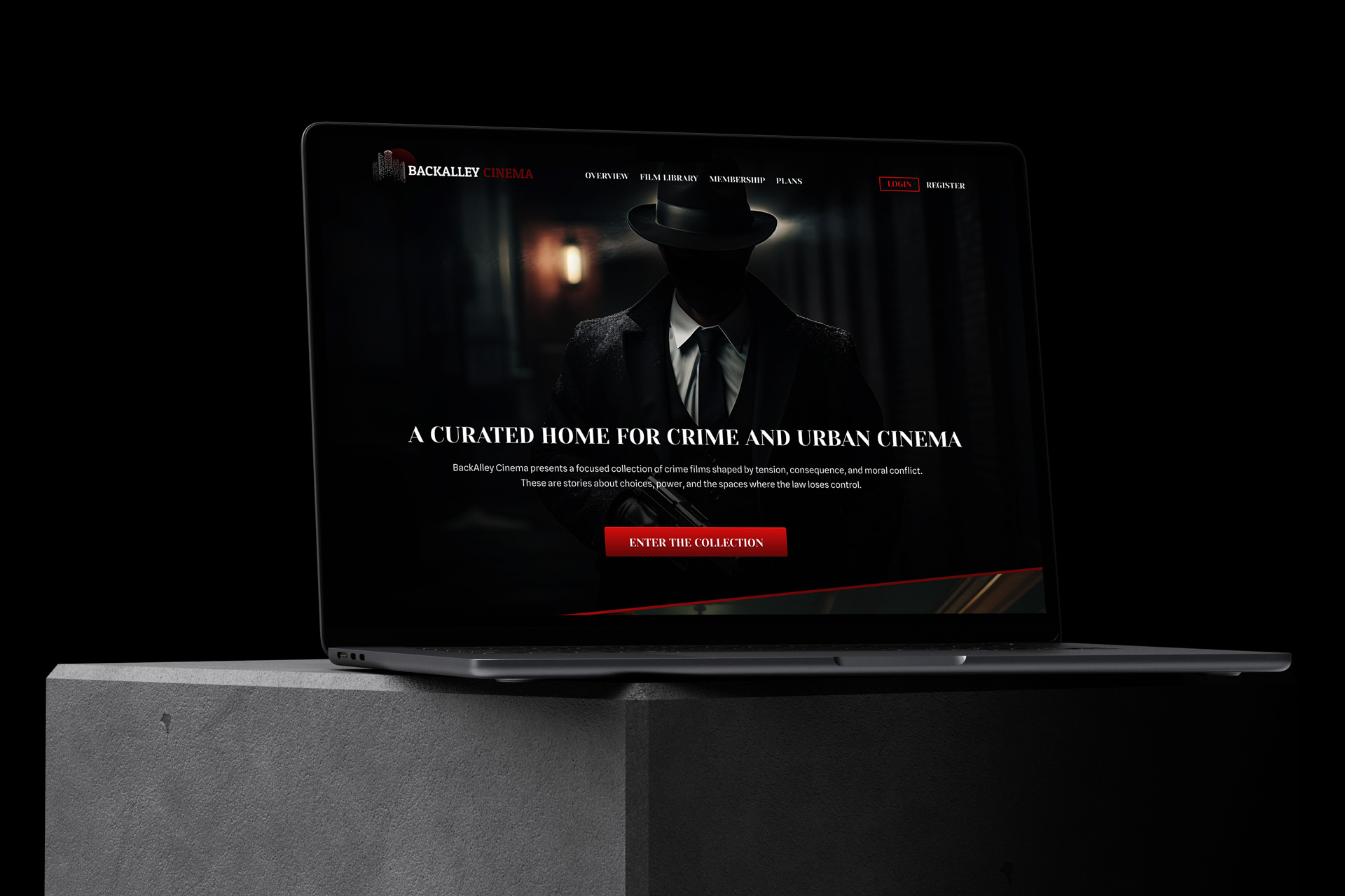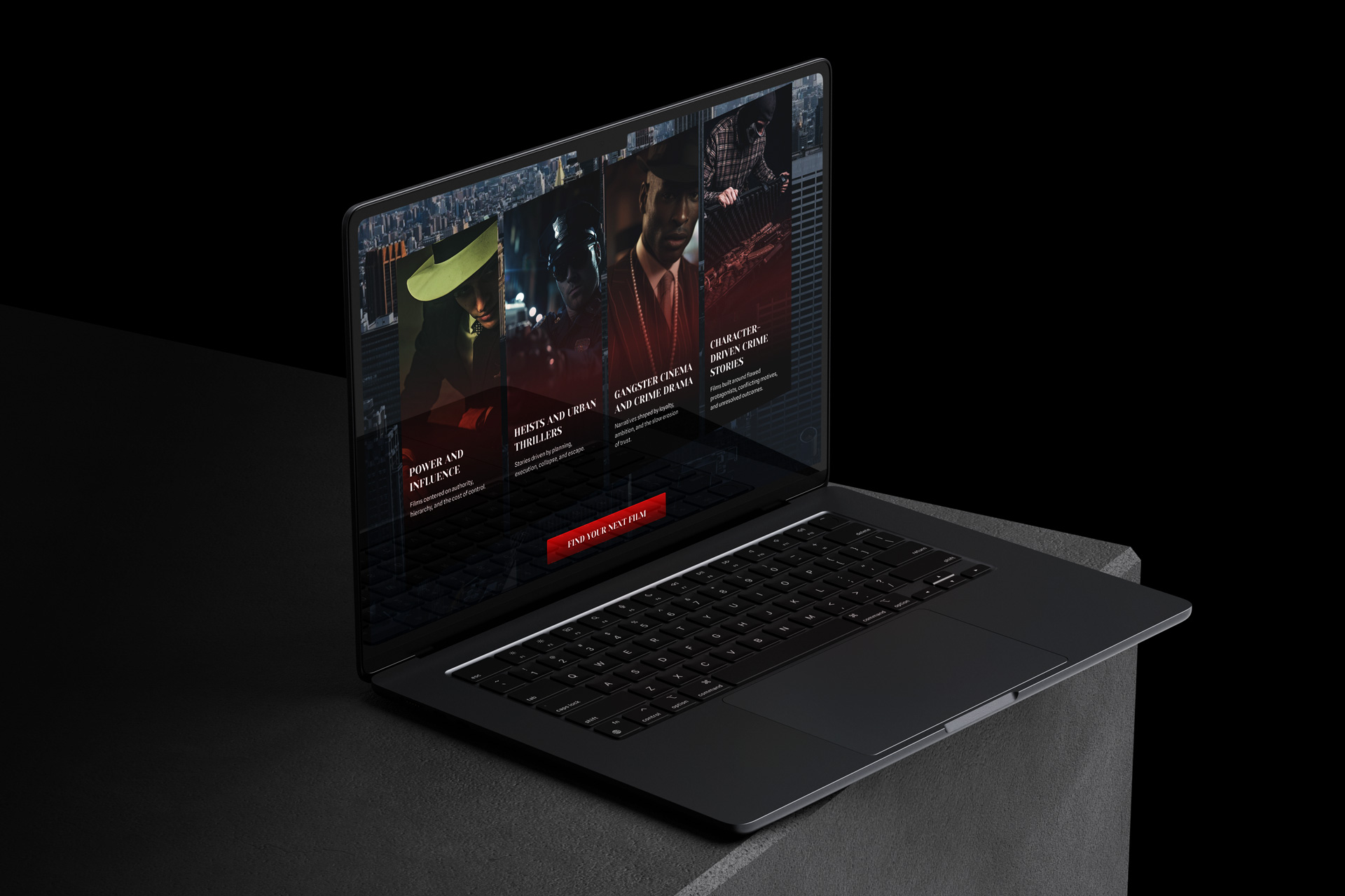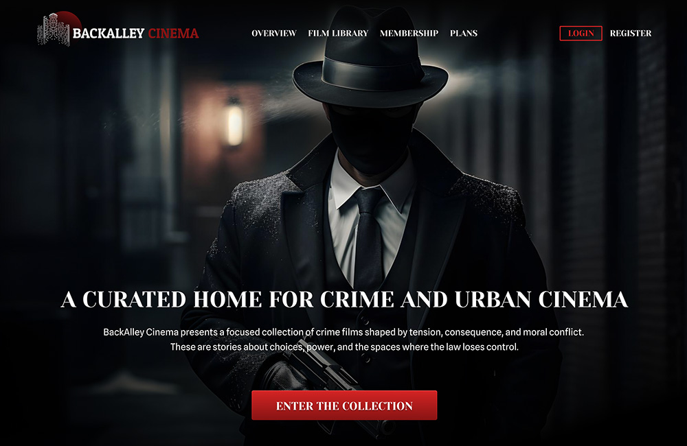 Дизайн лэндинга для платформы о криминальном и городском кино. Сайт собран как нуарная витрина: темная атмосфера, жесткая драматургия блоков и четкий маршрут по странице.