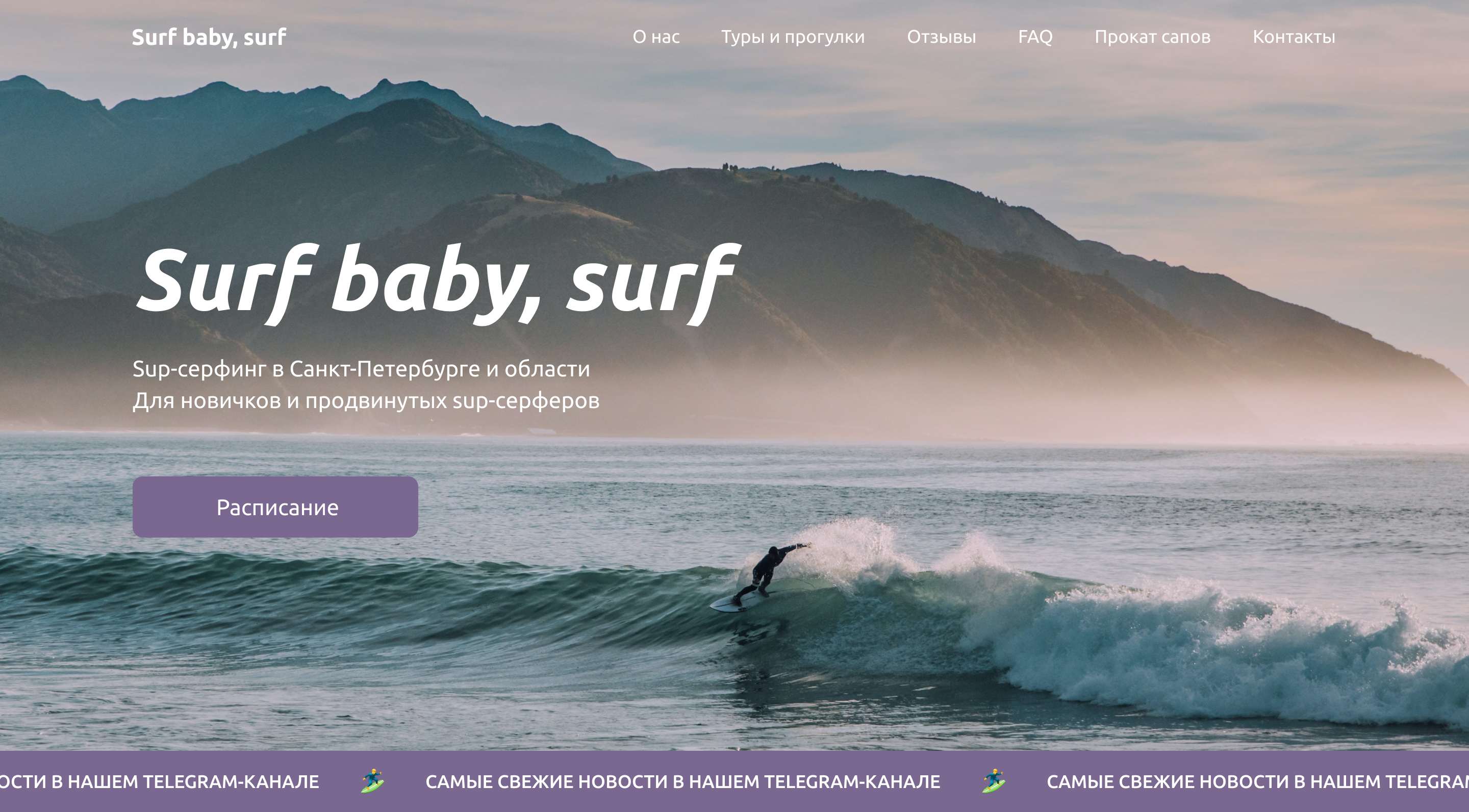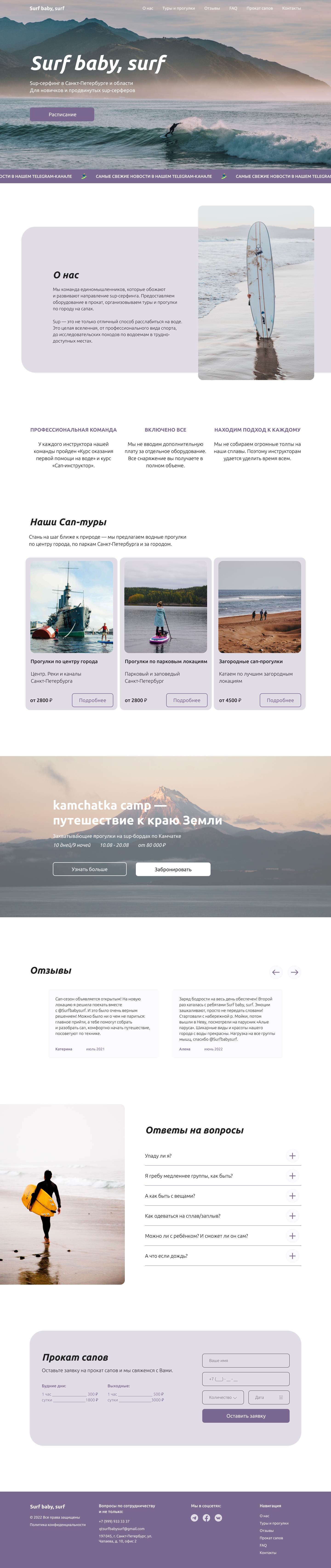 Дизайн сайта компании с Surf baby, surf, предоставляющей услуги sup-серфинга в Санкт-Петербурге, области и в отдаленных местах России. Данная работа была выполнена в рамках интенсива дизайн-студии Логомашина.