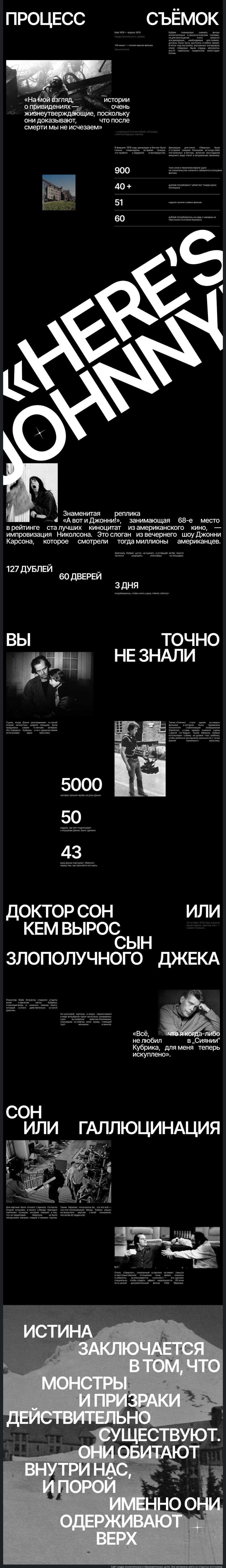 Лонгрид о съемках фильма "Сияние". Гнетущая атмосфера фильма передается в дизайне с помощью таких приемов как контраст размеров (неожиданно крупная типографика), ахроматическая палитра, узкие поля и выравнивание текста по ширине.