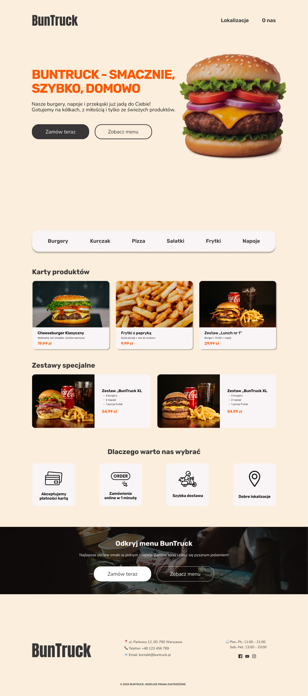 Проект BunTruck я создал как сайт для фудтрака с уличной едой. Я хотел показать энергию городской жизни и вкус хорошей еды простым, современным способом.