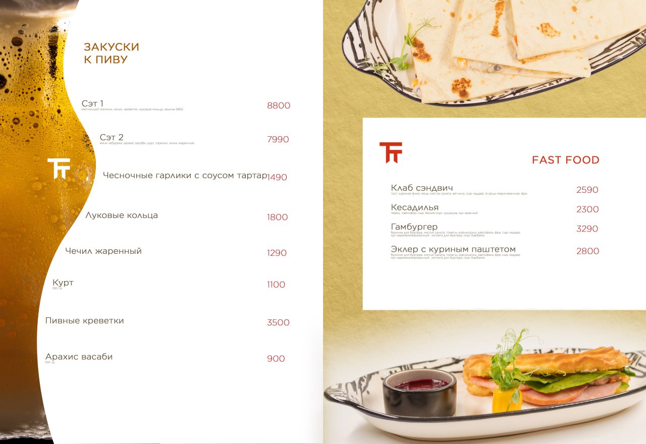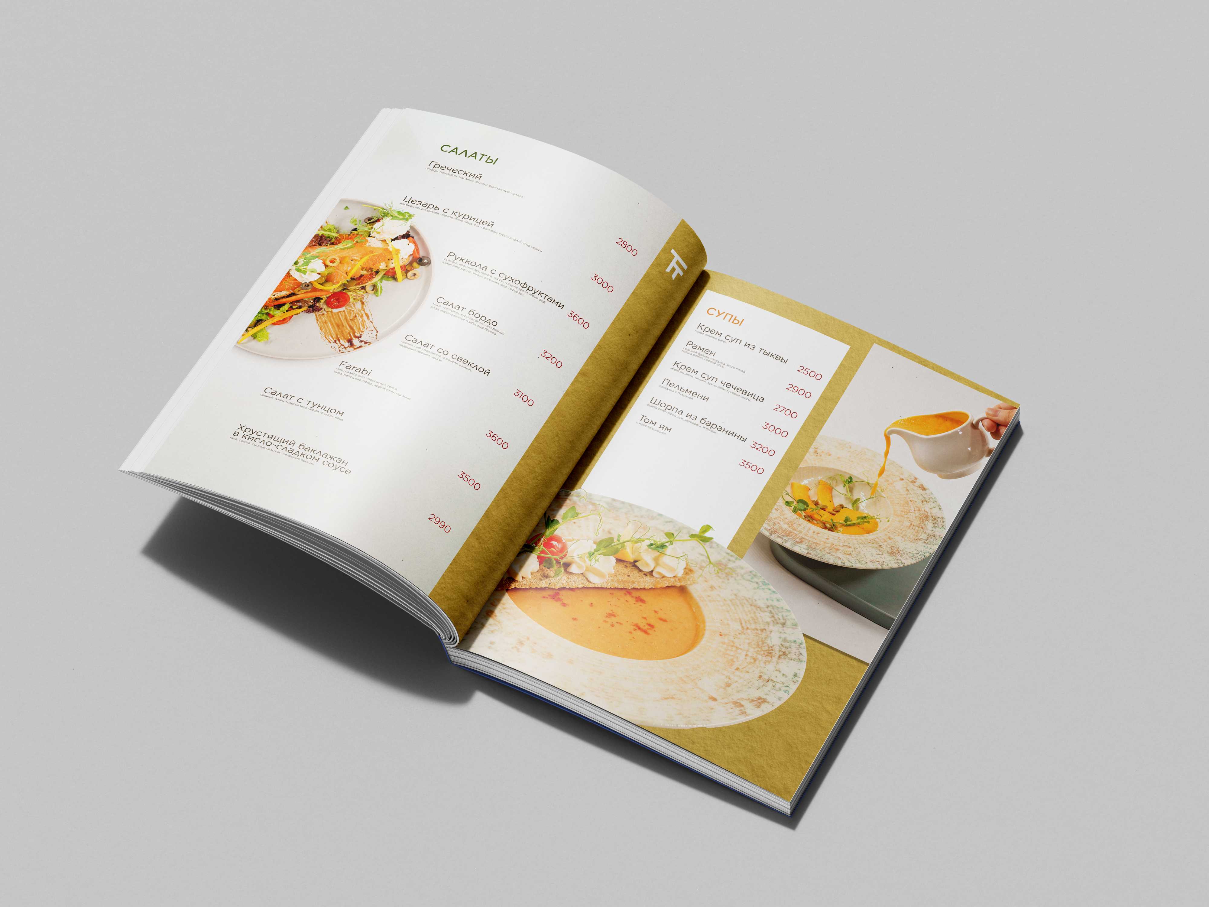 Дизайн меню основан на сочетании благородных золотистых текстур, воздушных белых блоков и акцентного фирменного красного цвета. Это создаёт ощущение лёгкости, изысканности и высокого уровня сервиса.