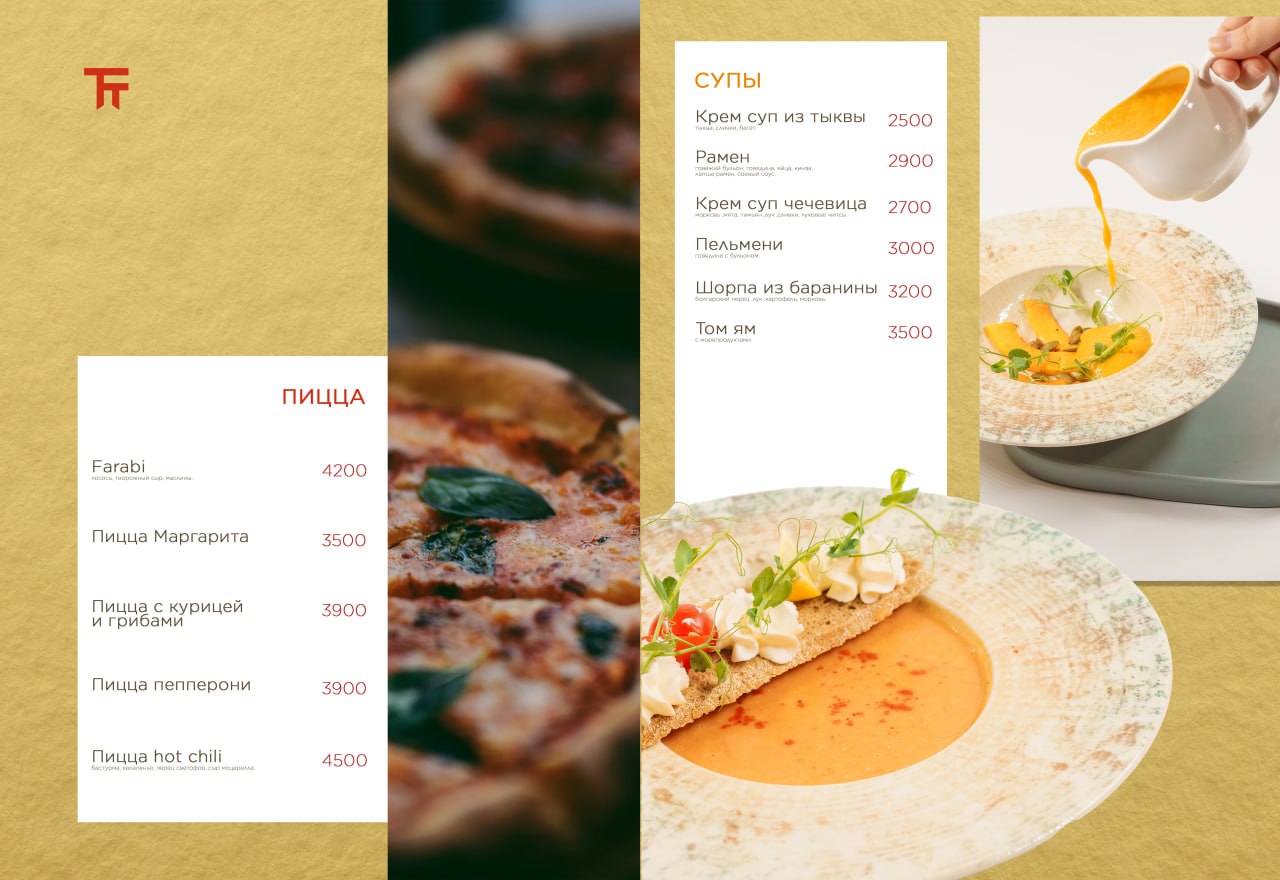 Для ресторана The Farabi Terrace я разработал стильное, современное и премиальное меню, продолжив и усилив фирменный стиль заведения. Основная задача — создать полноценный визуальный продукт, который будет передавать атмосферу ресторана, подчёркивать высокое качество кухни и обеспечивать удобную навигацию для гостей.