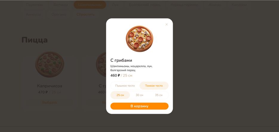 Полностью рабочий интерфейс с выбором топпингов, пиццы и модальных окон с оформлением заказа.