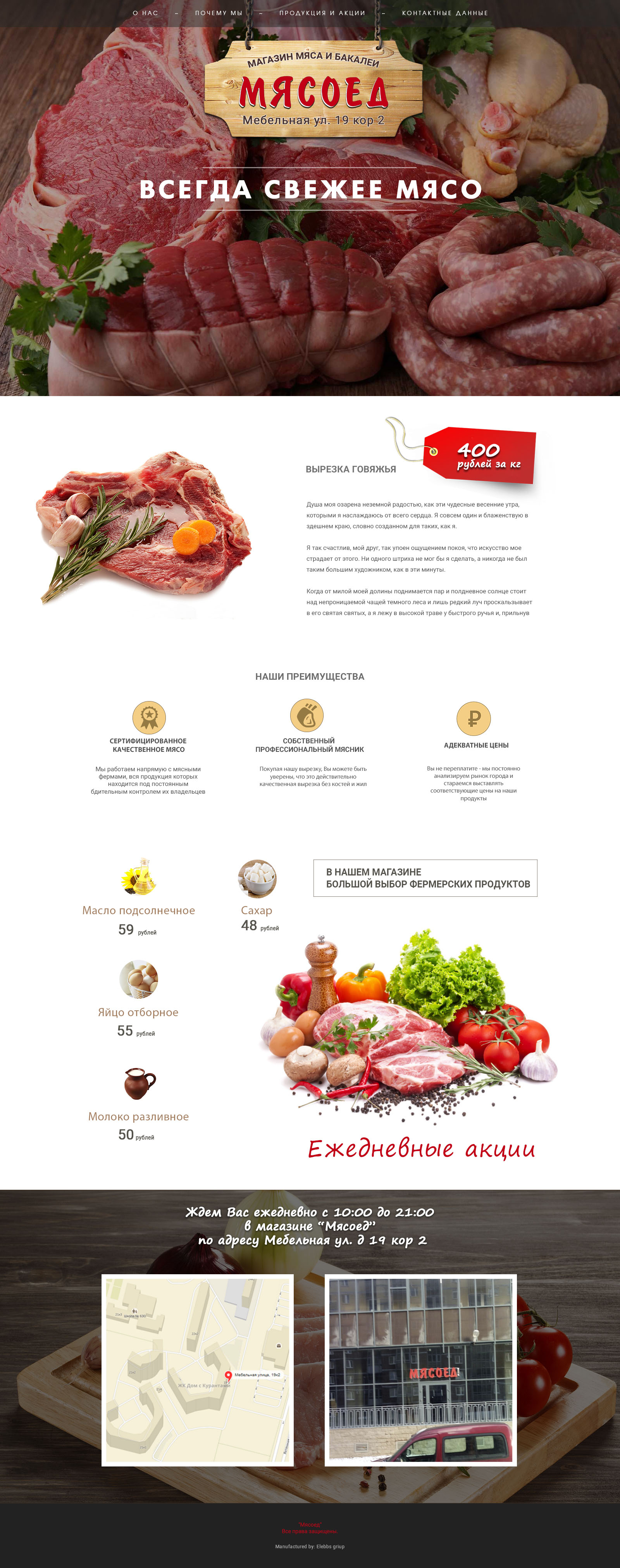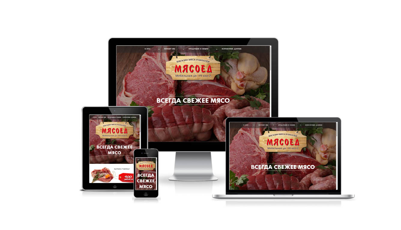 Адаптивная верстка сайта. Отображение на планшетах и мобильных делал на свое усмотрение без адаптивного дизайна. Верстка: http://flake.pusku.com/Myaso/