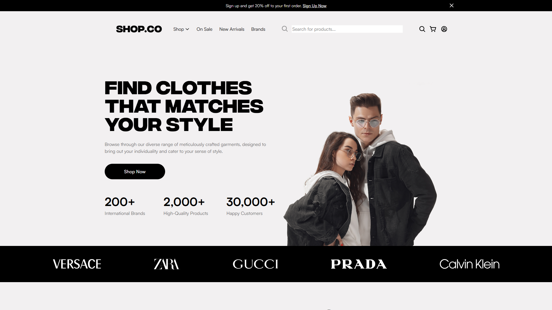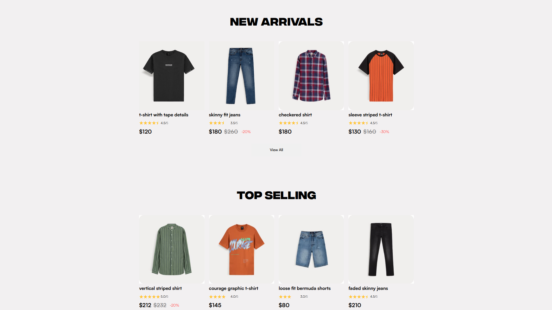 Каталог товаров с ценами, скидками и рейтингами (New Arrivals, Top Selling).