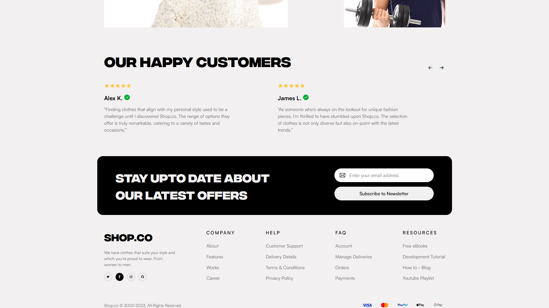Блоки с отзывами клиентов и формой подписки на рассылку.