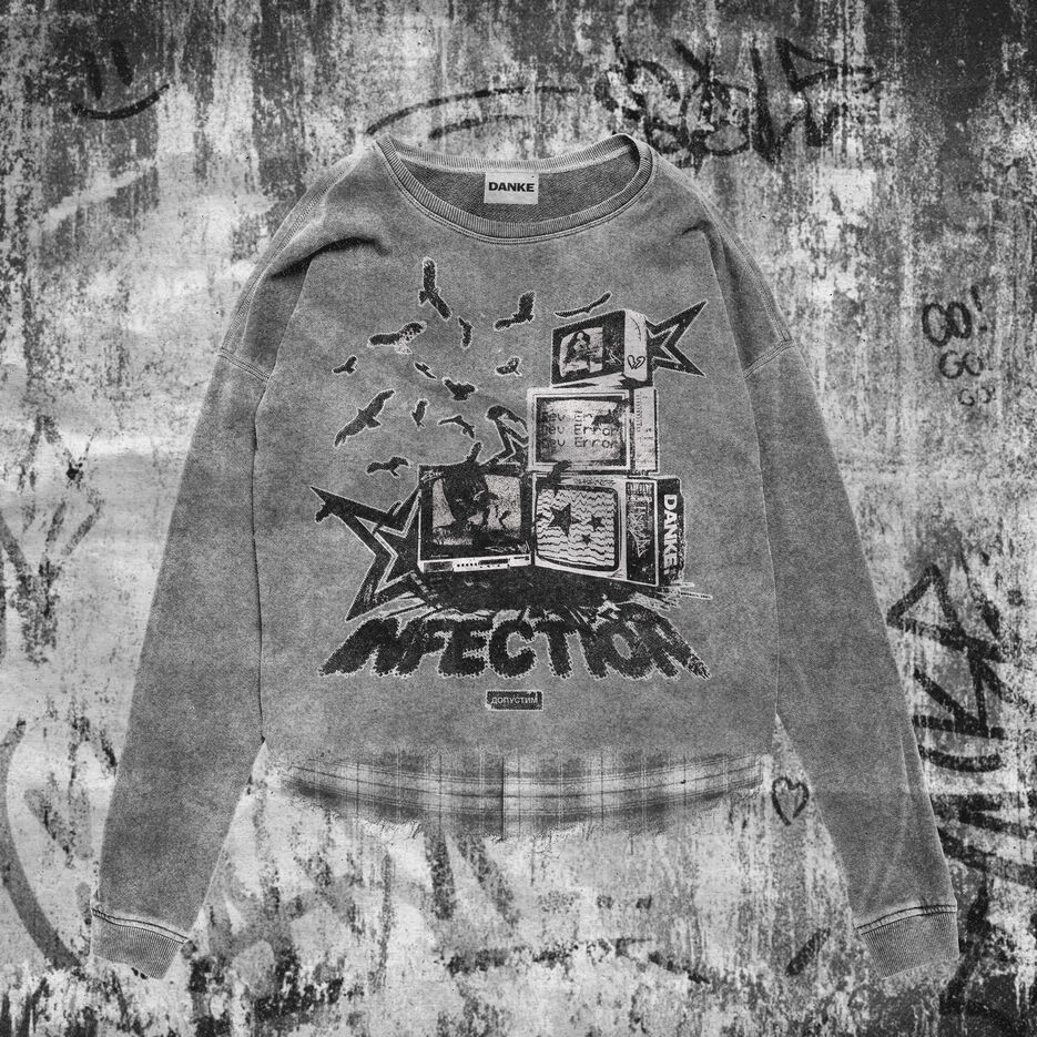 Надпись INFECTION расположена в винтажном стиле, а элементы трещин и потёртостей добавляют дизайну атмосферности и уникальности.Смысл этого принта заключается в борьбе против информационной пропаганды. Он напоминает нам о необходимости быть бдительными и внимательными к тому, что мы видим и слышим в информационной среде.