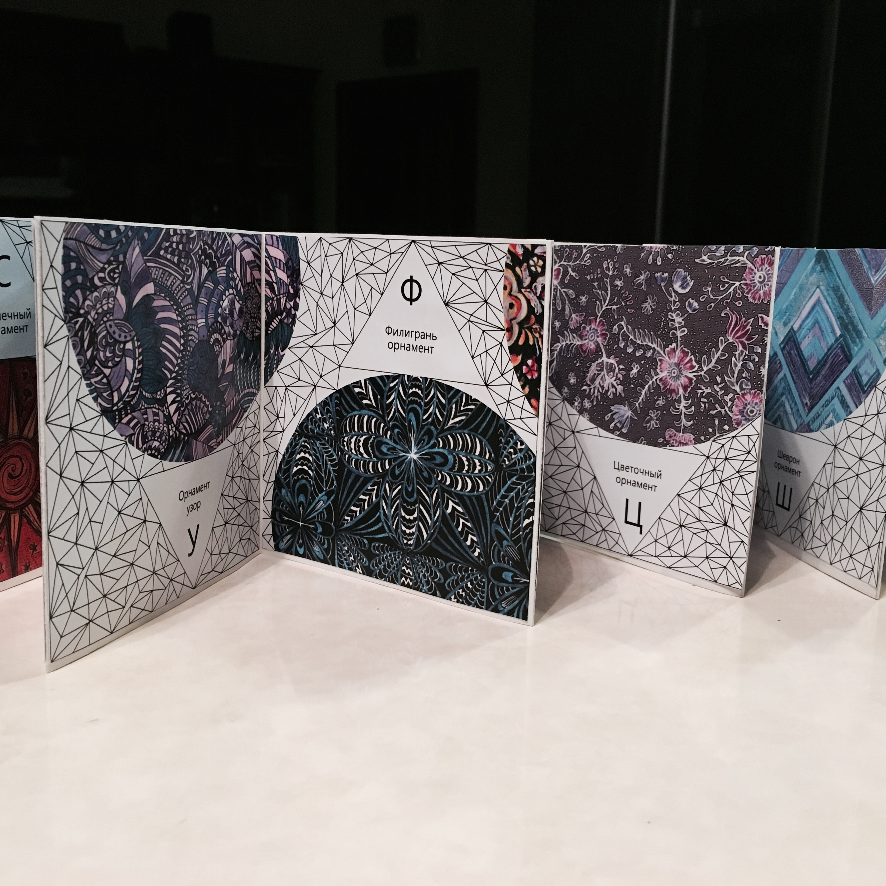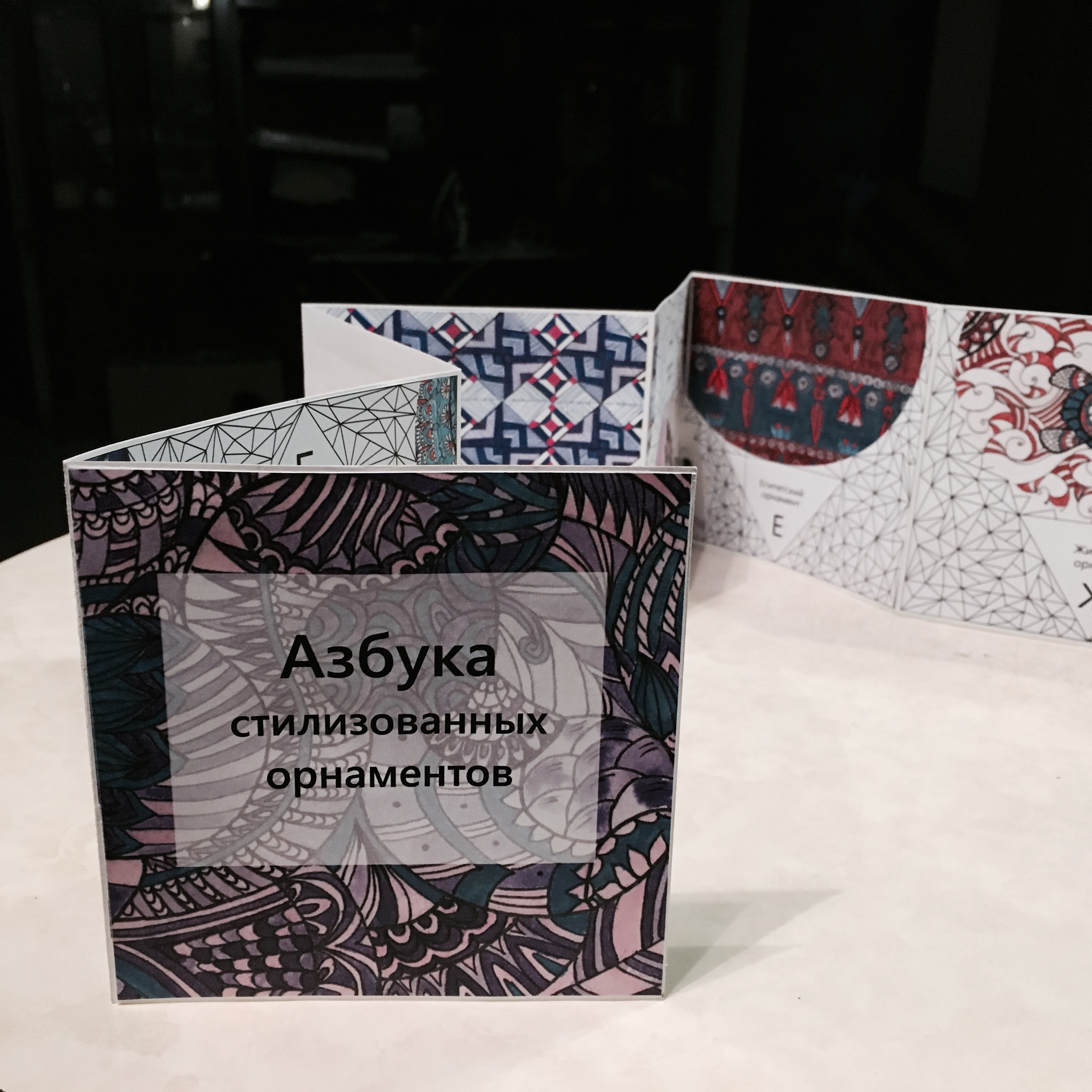 Макет книжки раскладушки !Азбука стилизованных орнаментов". Вся графика выполнена в ручную, графическими материалами, такими как: линеры, акрил, тушь.