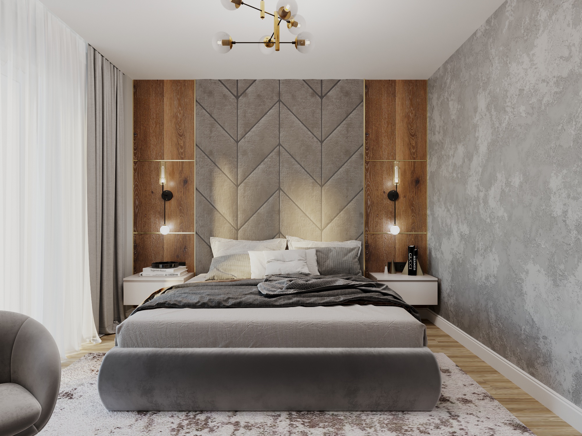 Отделка стен декорштукатуркой в спальне? Это шик. И увидели мы это уже на стадии 3d визуализации.