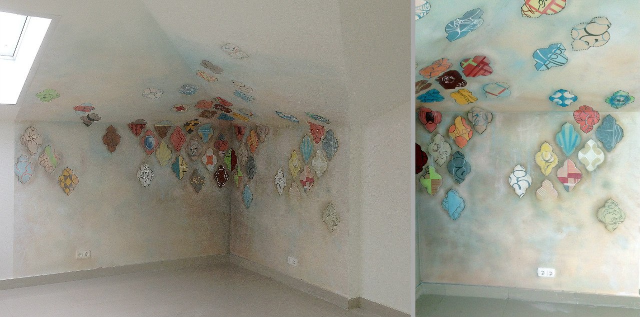 Роспись по декоративной штукатурке.Аэрография-кисть, эскиз видоизмененный из инета