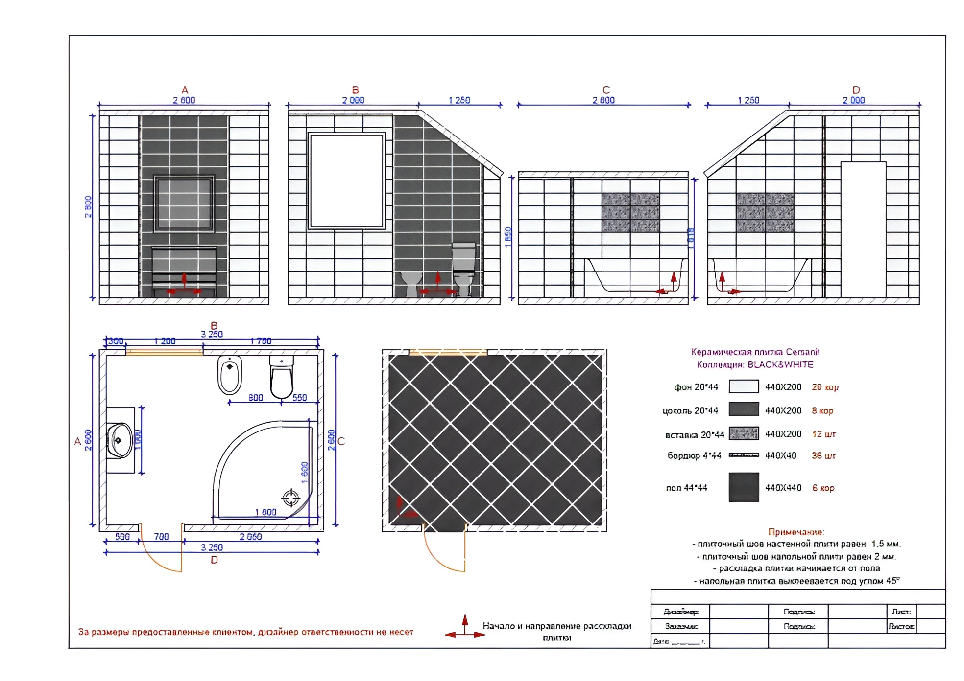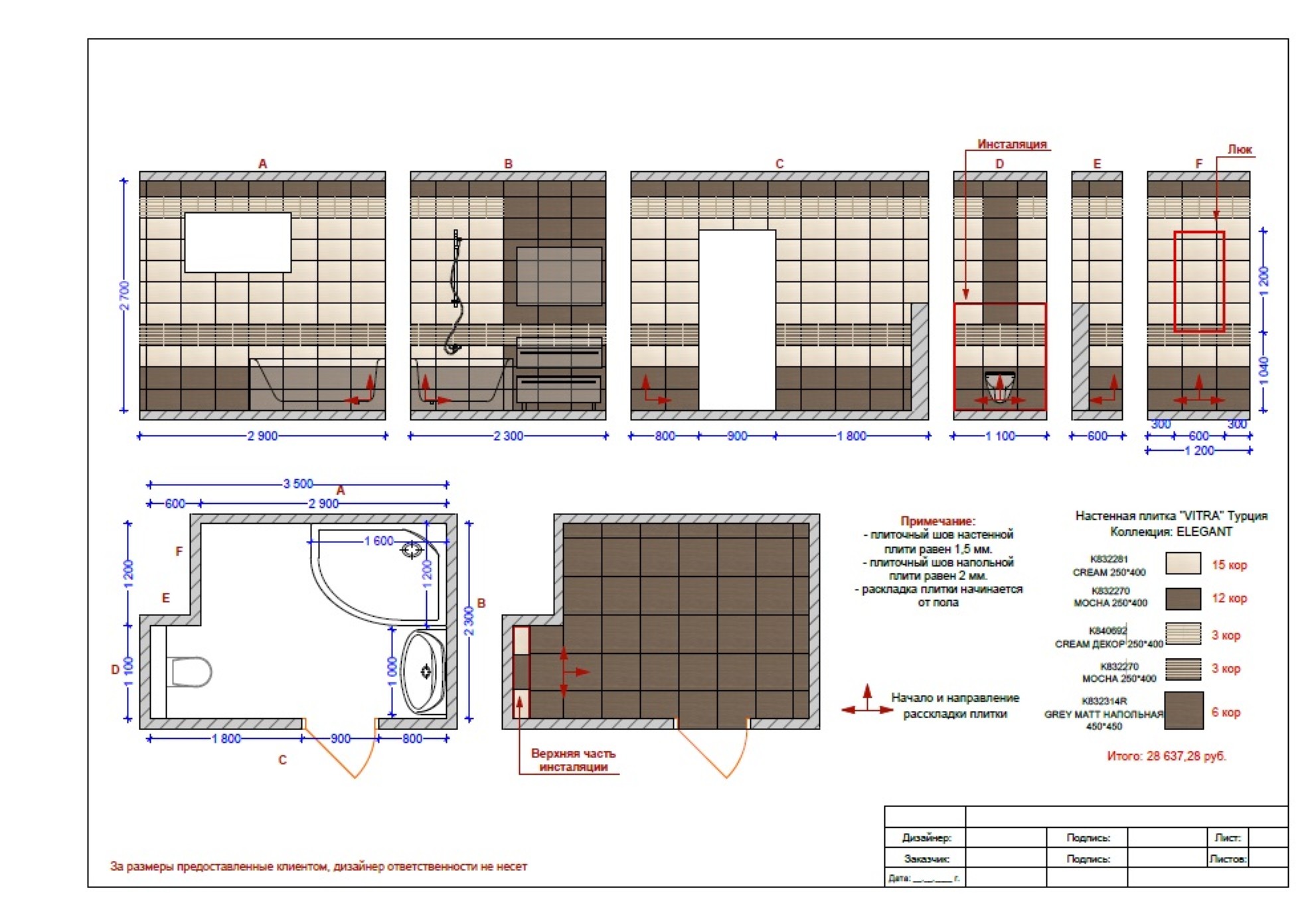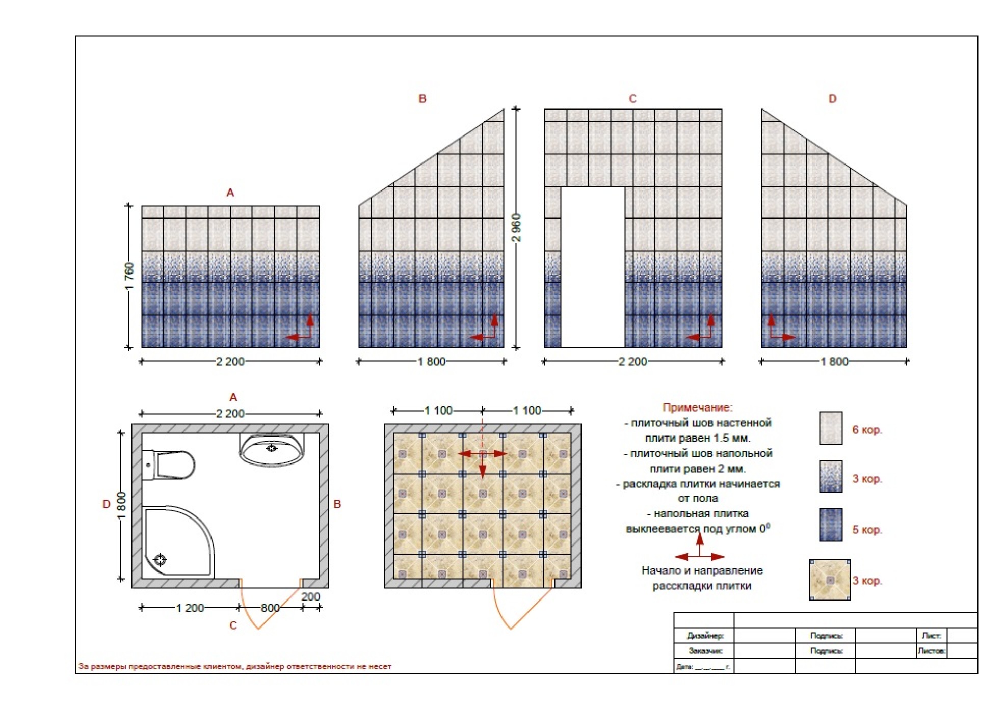 2D чертеж раскладки плитки, керамогранита, по размерам вашего помещения (ванная комната, санузел, кухонный фартук, душевая или двор), готовый план для мастера, расчет количества плитки.