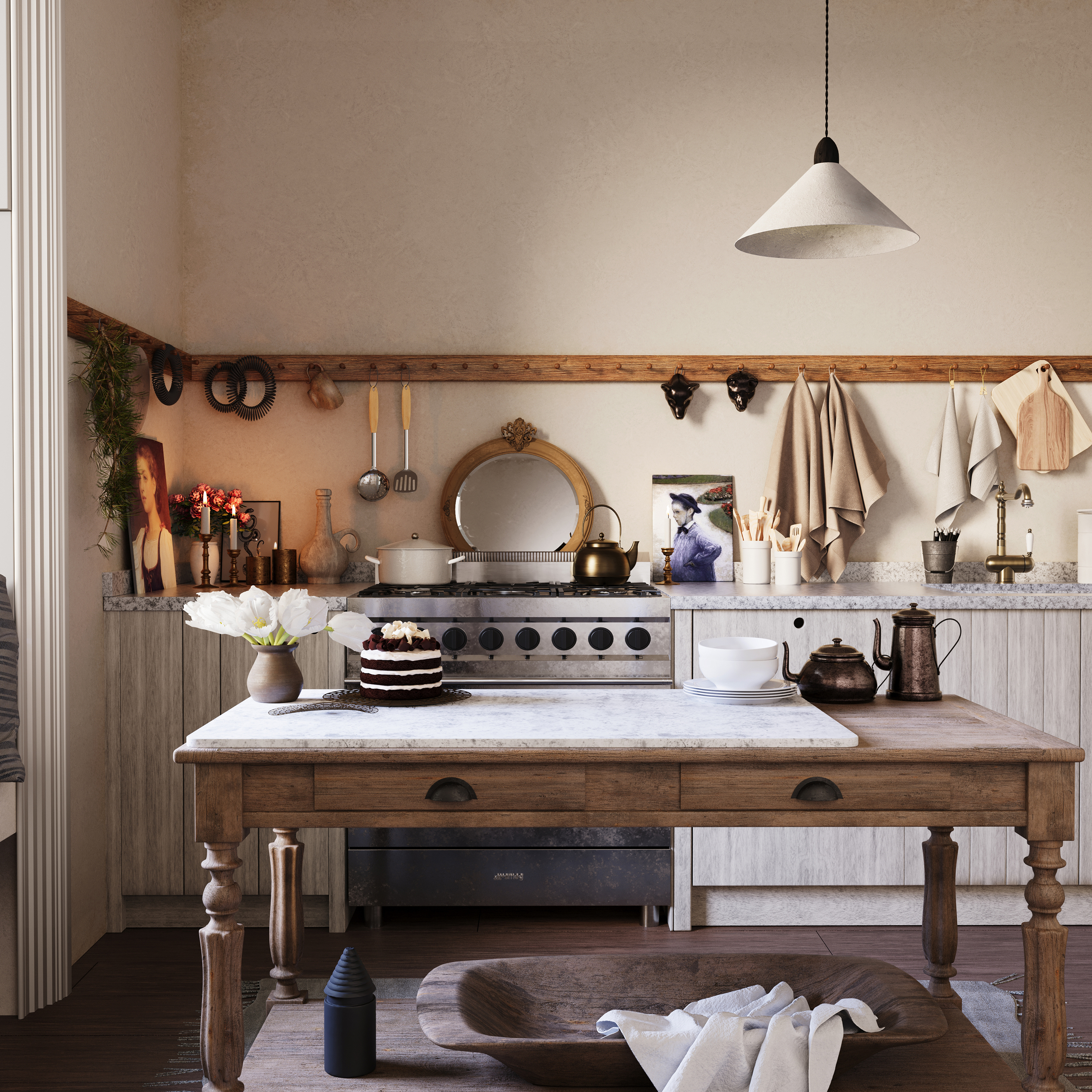 Тёплый дневной свет мягко заполняет пространство, подчеркивая текстуру натурального дерева и неровности штукатурки. Центральный элемент композиции — массивный деревянный остров, сочетающий функциональность и эстетику. На фоне — детали, создающие атмосферу жизни: картины, посуда, полотенца, цветы и торт, готовый к утреннему чаепитию.