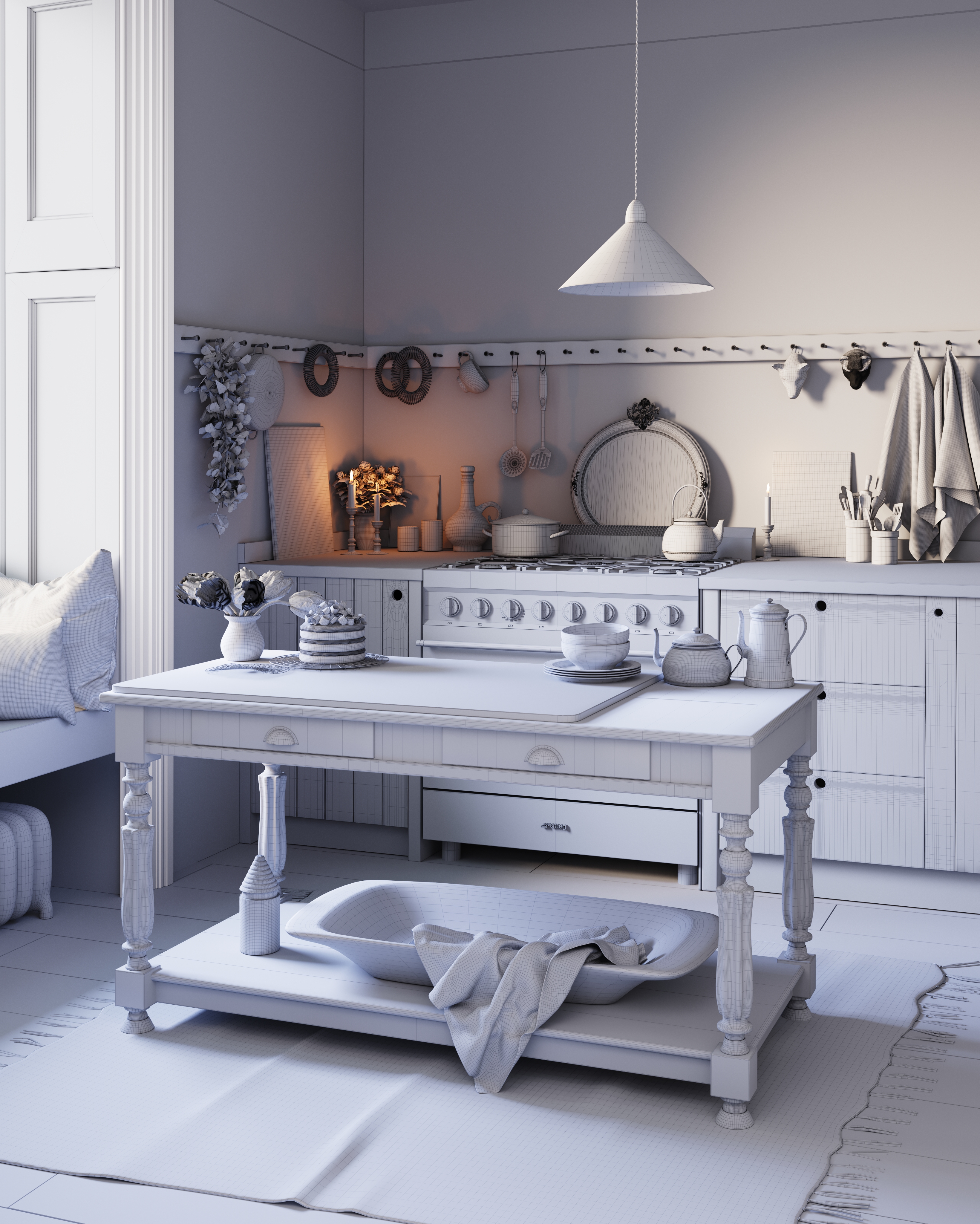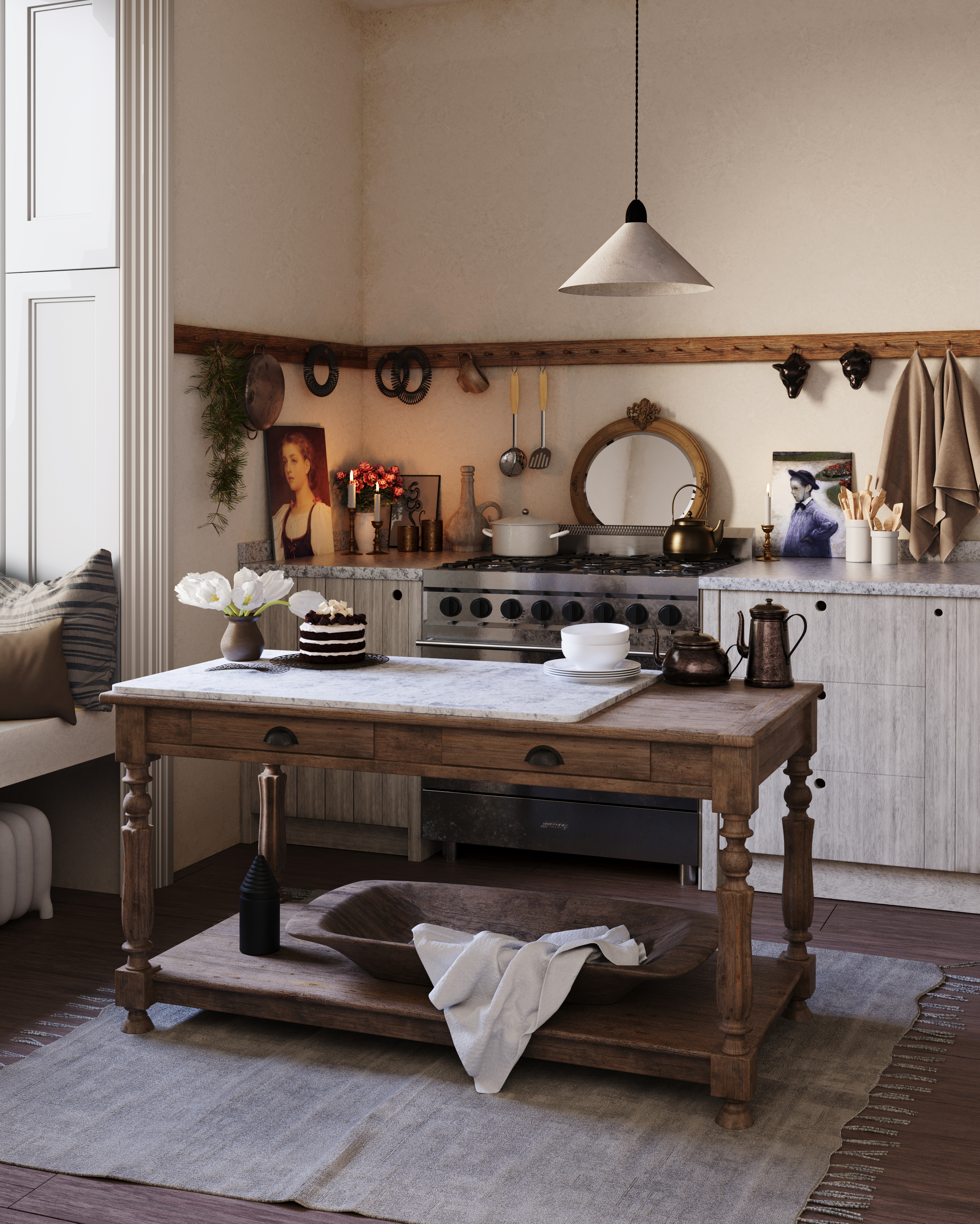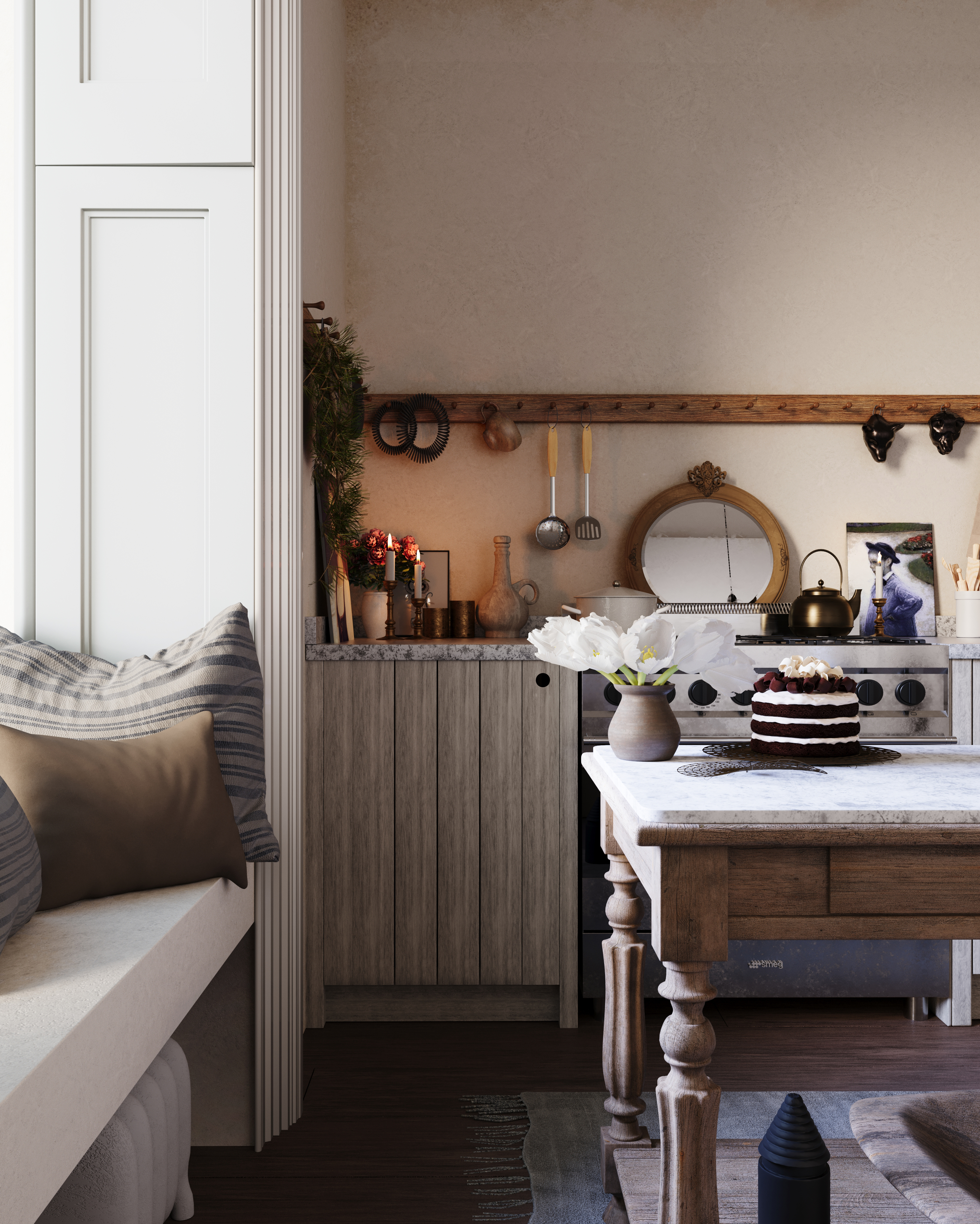 3D визуализация уютной кухни в стиле rustic minimalism, созданная в 3ds Max с использованием Corona Renderer.