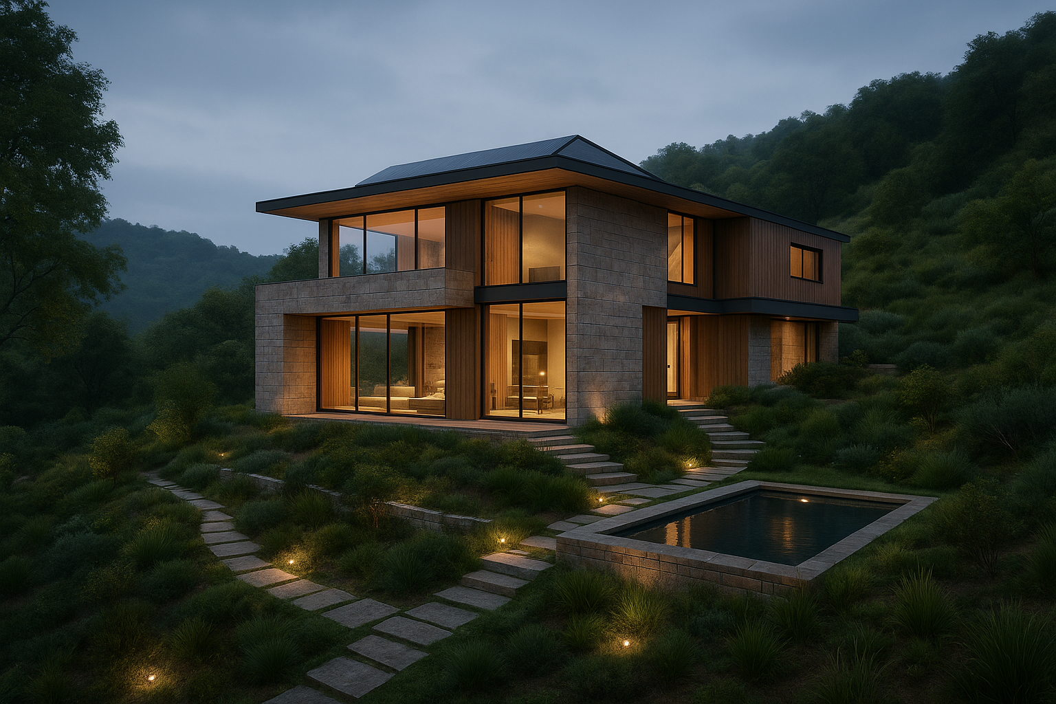 Концепція: Цей проєкт демонструє візуалізацію сучасної еко-резиденції, інтегрованої в природний ландшафт на схилі пагорба. Основна ідея полягала у створенні гармонійного поєднання архітектури з навколишнім середовищем, використовуючи принципи сталого дизайну та натуральні матеріали.