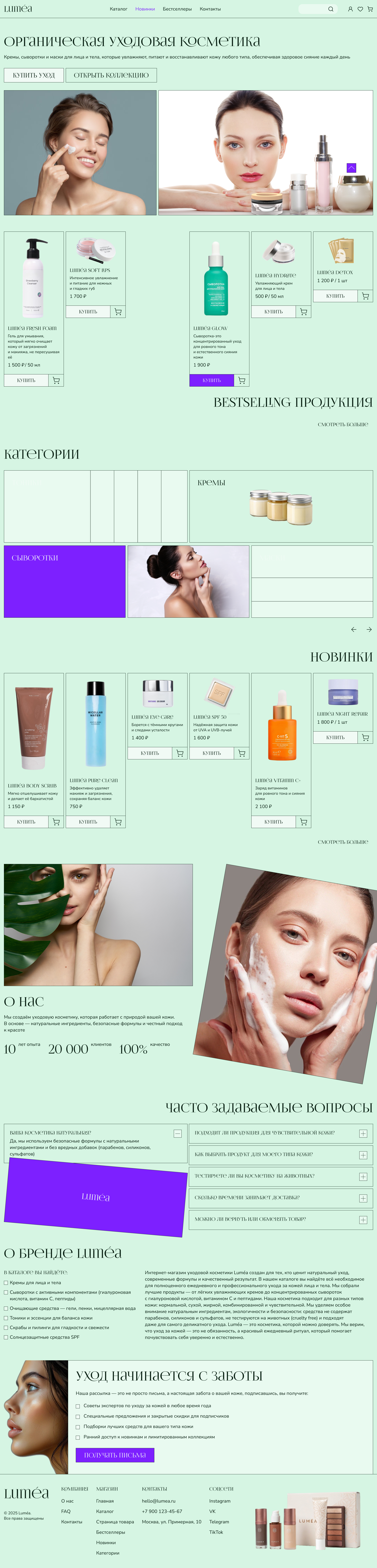 Это концепт-дизайн интернет-магазина органической косметики Luméa. Основная цель проекта — показать, как может выглядеть современный онлайн-магазин с акцентом на натуральность, экологичность и удобство покупателя. ( есть адаптивы на все страницы в 4 разрешениях 960, 768, 480, 360 )