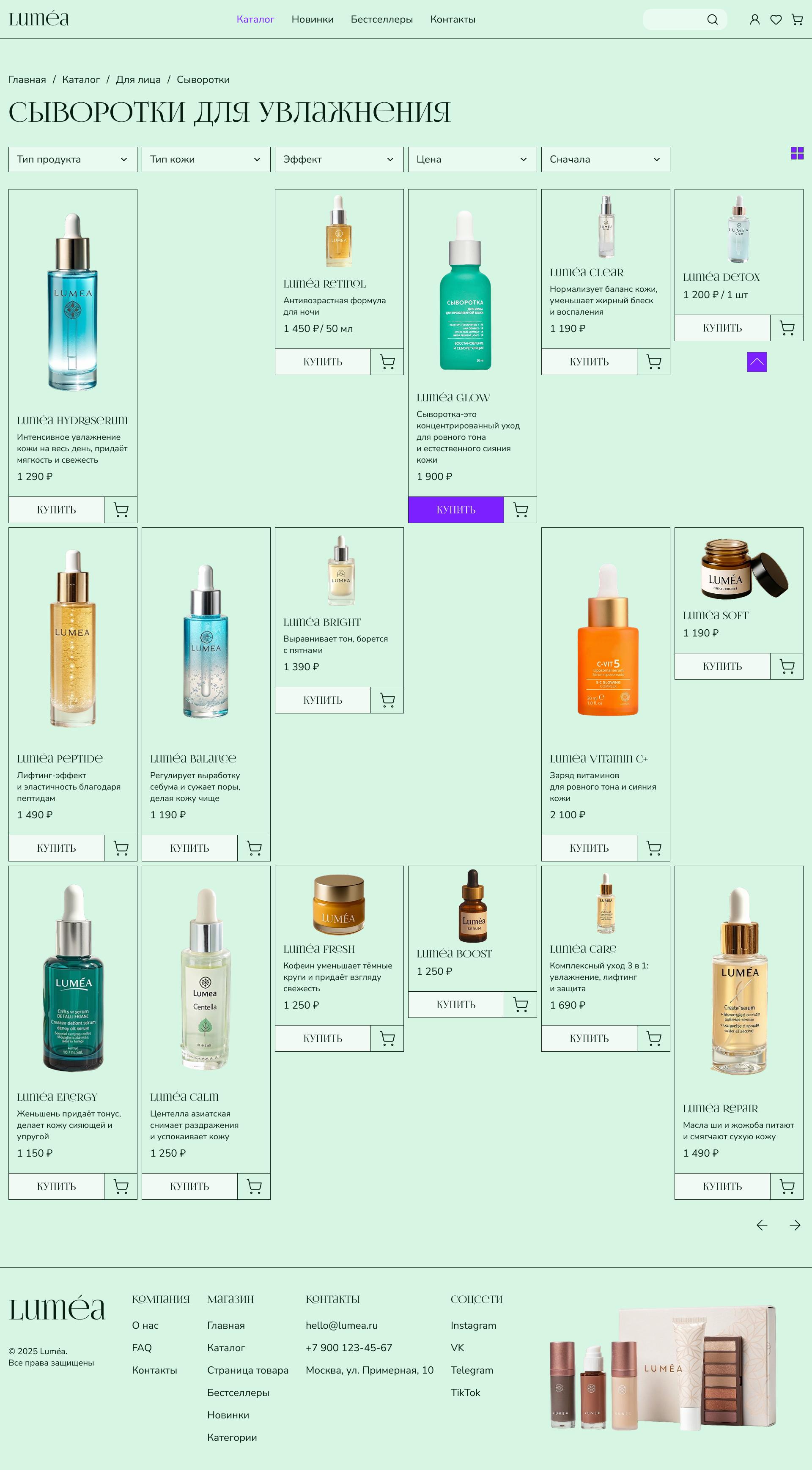 2. Каталог товаров (горизонтальный и вертикальный варианты) — с фильтрацией по типу, потребностям кожи, эффектам и цене