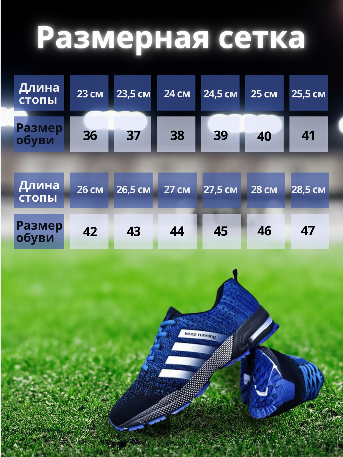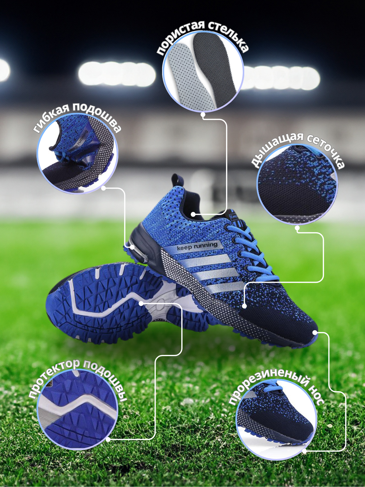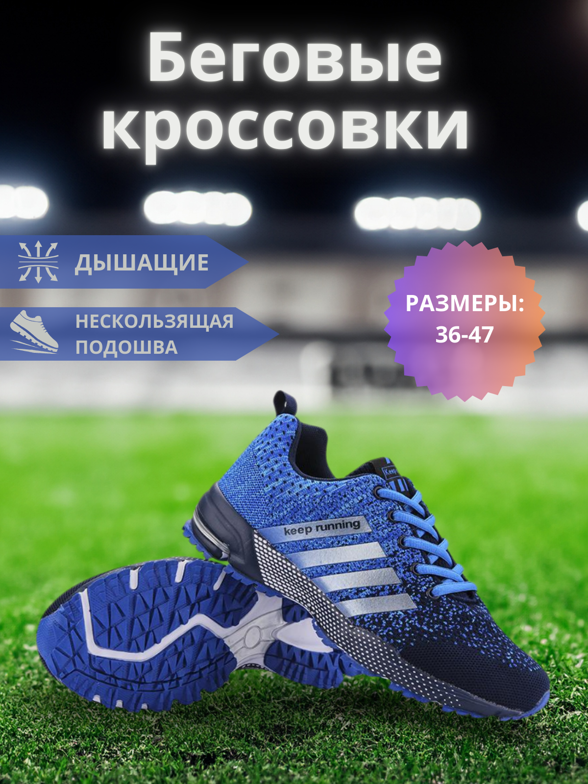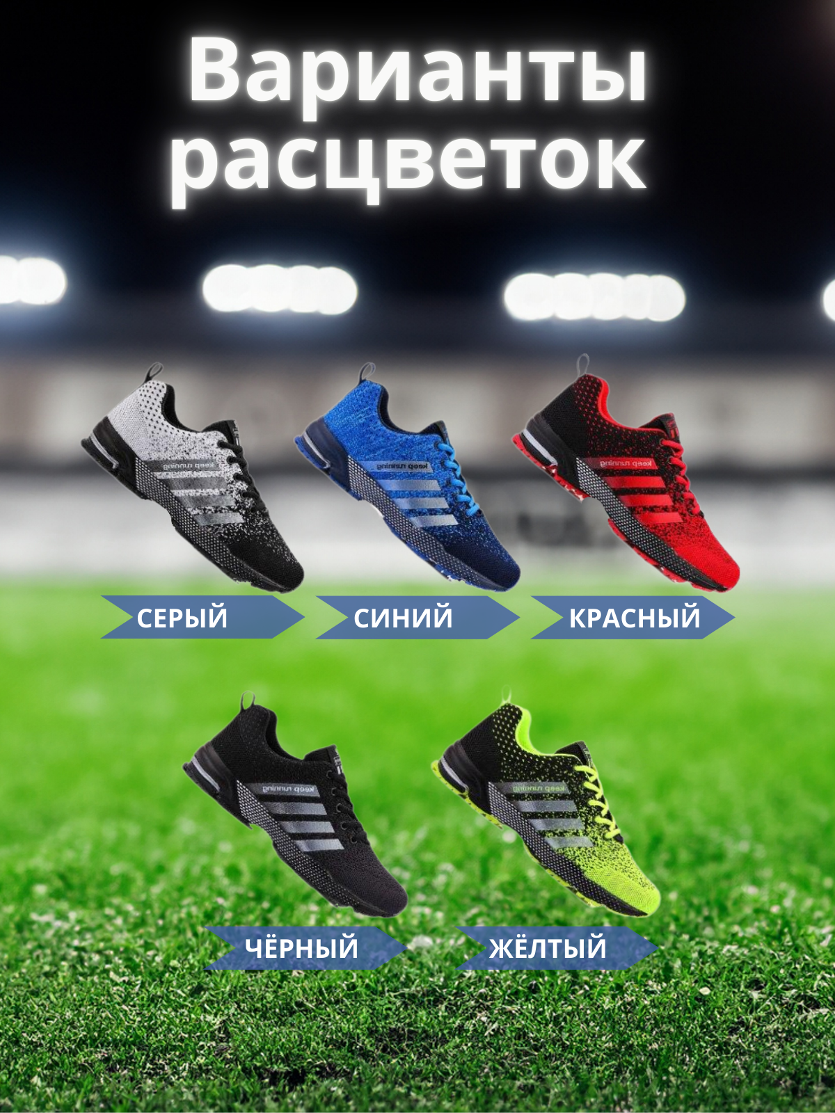 Сет слайдов для карточки с беговыми кроссовками. Фон для слайдов в виде трибуны и стадиона подчеркивает предназначение обуви. Сочные цвета приковывают взгляд и внимание.