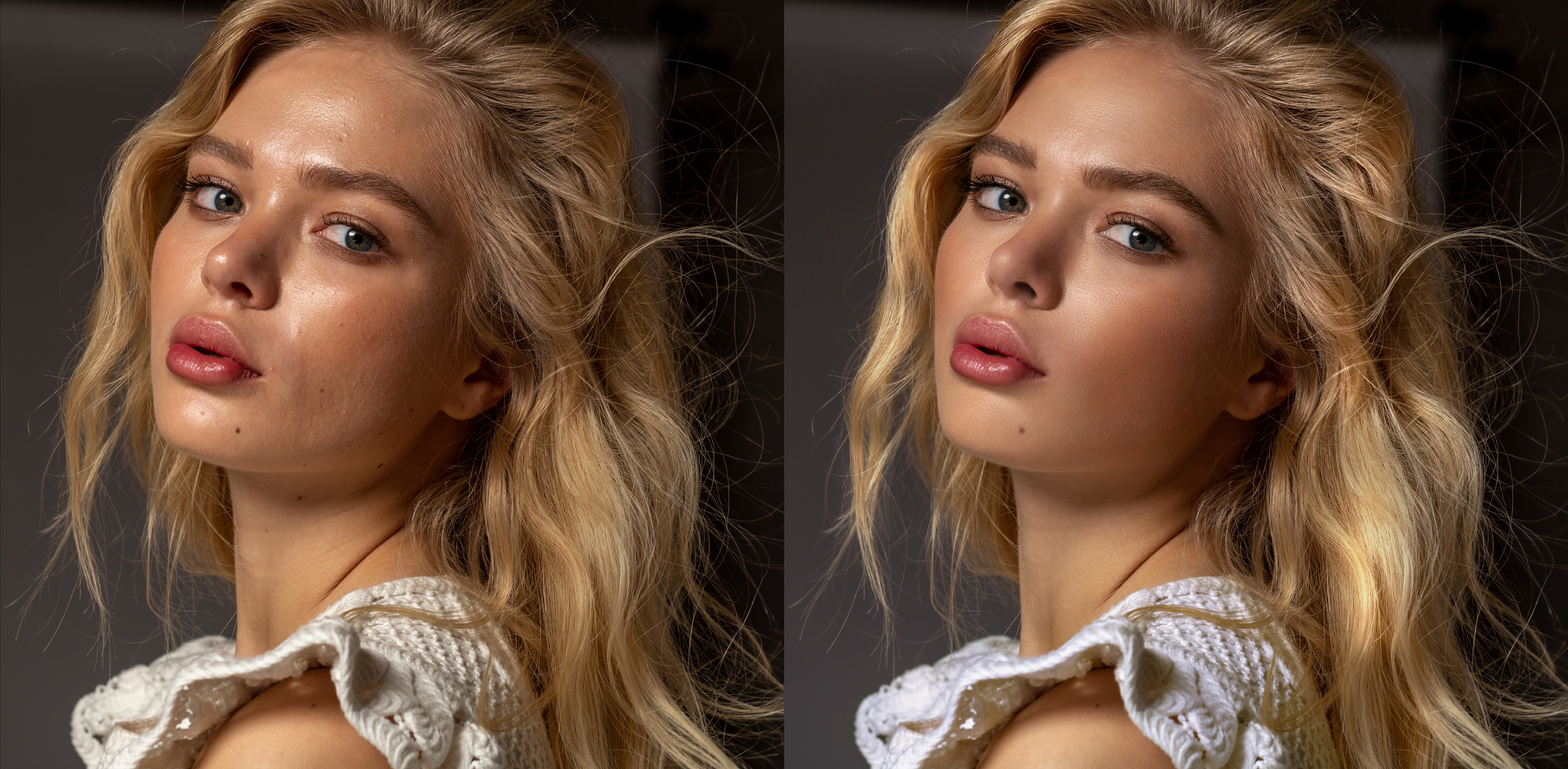 Выполнена ретушь кожи с использованием частотного разложения и Dodge & Burn, коррекция цвета и света, выравнивание тонов, доработка объёма. Портрет обработан с сохранением естественности, без замыливания текстур.