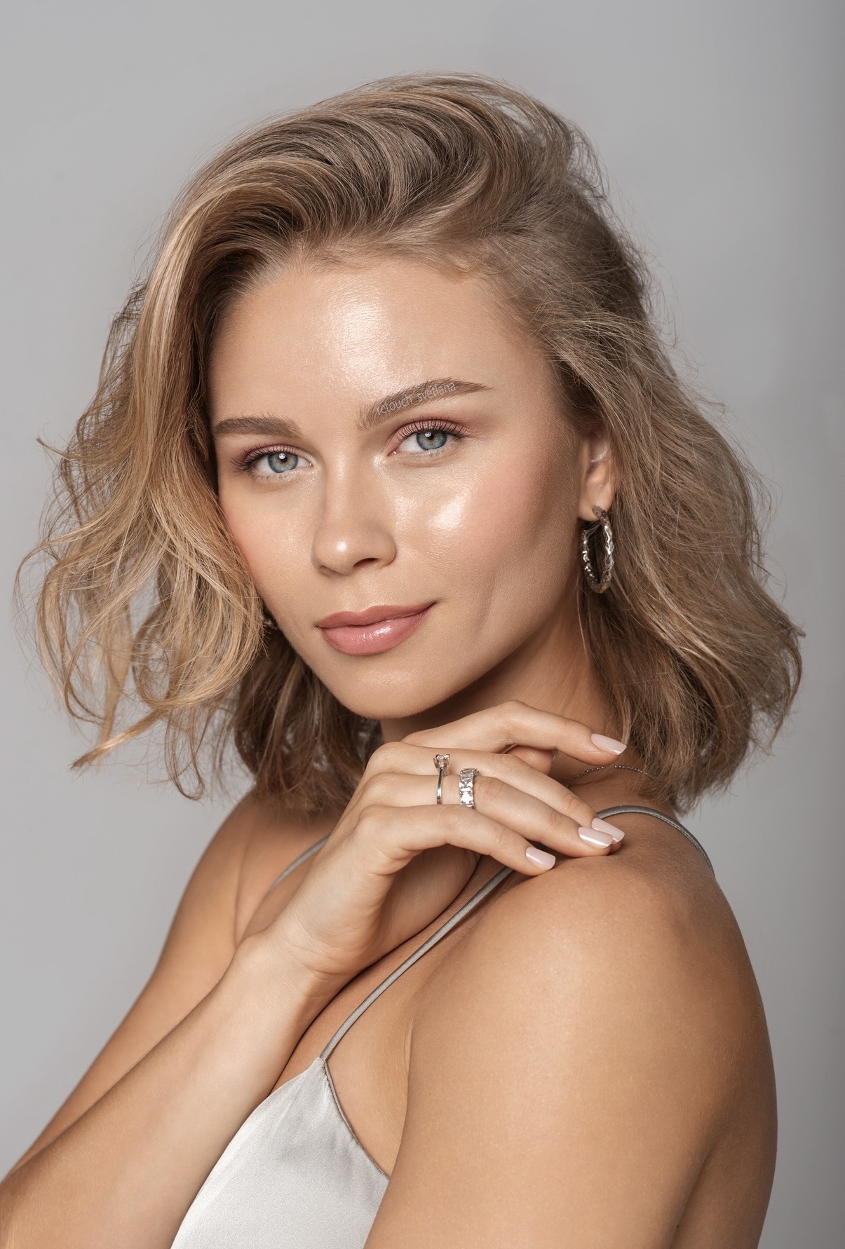В работе выполнено: детальная бьюти-ретушь, очистка фона, удаление выбивающихся волосков, тщательная чистка кожи, аккуратная пластика лица и тела, работа с бровями и ресницами, коррекция макияжа, устранение покраснений кожи с сохранением естественной текстуры, а также проработка кожи в техниках Dodge & Burn и частотного разложения для выравнивания пятен и текстуры.