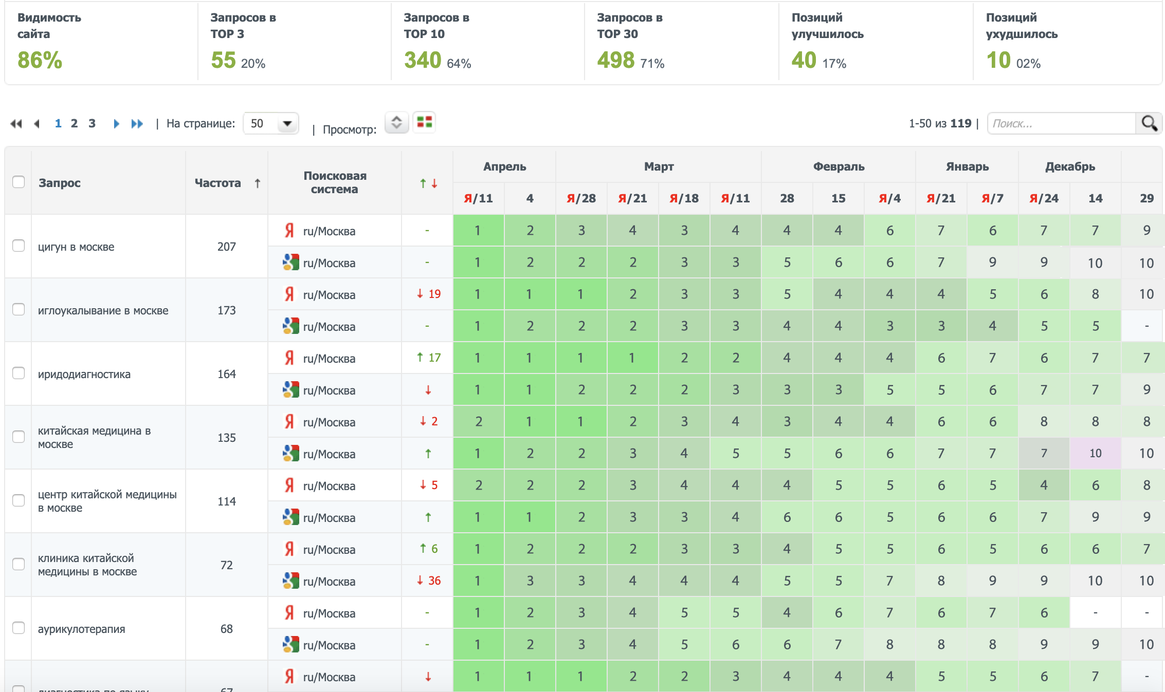 Клиника китайской медицины продвигается с июня 2016 года по настоящее время. Продвижение ведется по 314 запросам. Прежде чем сайт вышел в ТОП, ресурс приобрел новый дизайн, полностью переделана структура.