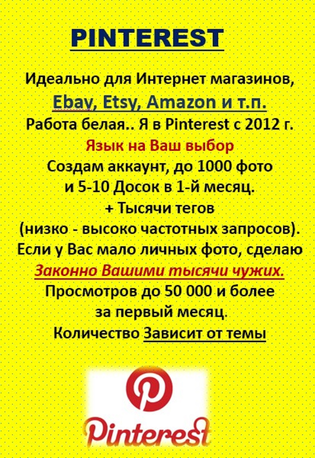Делаю аккаунт, 5-10 Досок, наполняю 500 - 1000 фото (пинов) в первый месяц.