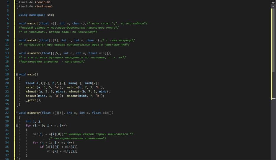 Решение задачи по нахождению минимальных и максимальных элементов для каждой строки двух матриц a[3x5] и b[7x7].