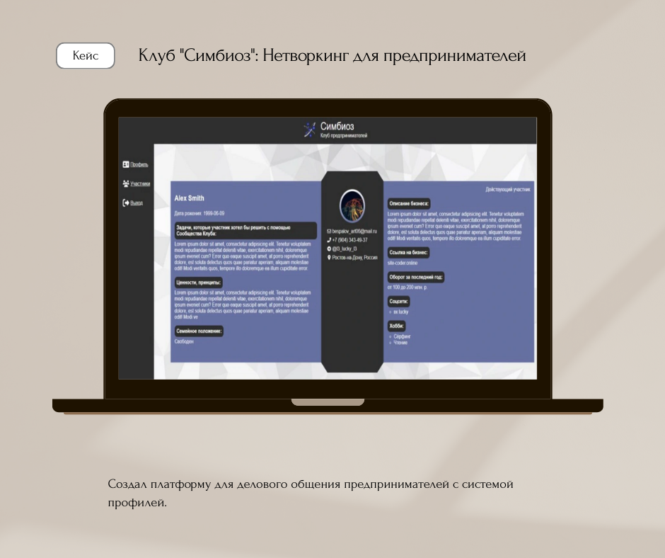 Создал платформу для делового общения предпринимателей с системой профилей.
