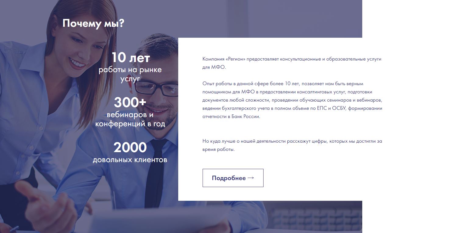 [h3]Продающий, адаптивный, стильный корпоративный сайт для компании, которая занимается бухгалтерской и юридической поддержкой МКК. Теперь клиент не только отличается от конкурентов профессионализмом, но еще и крутым сайтом.
