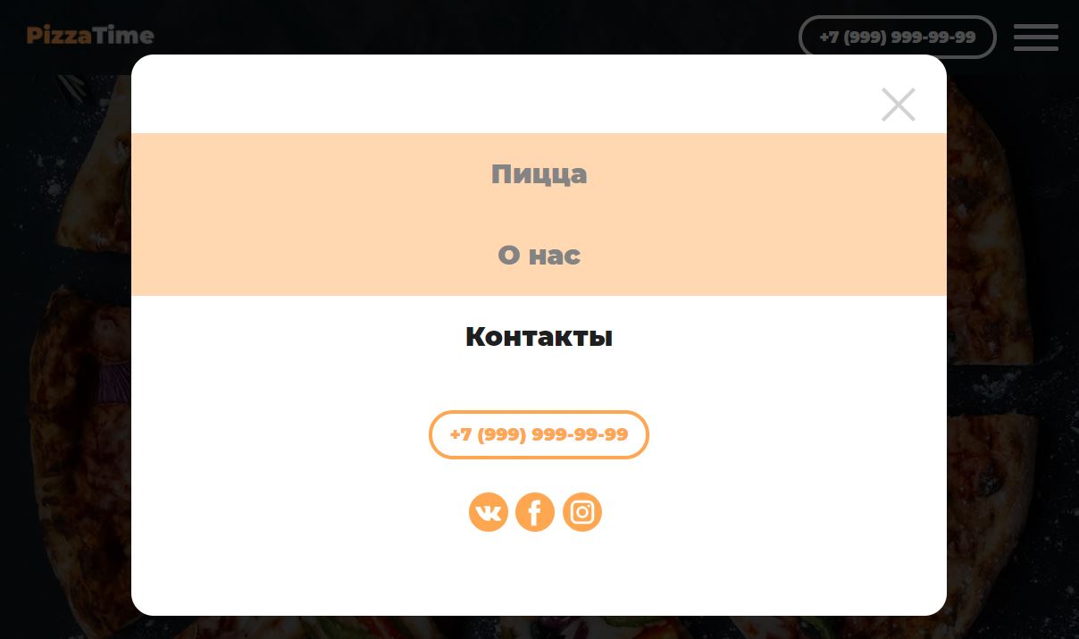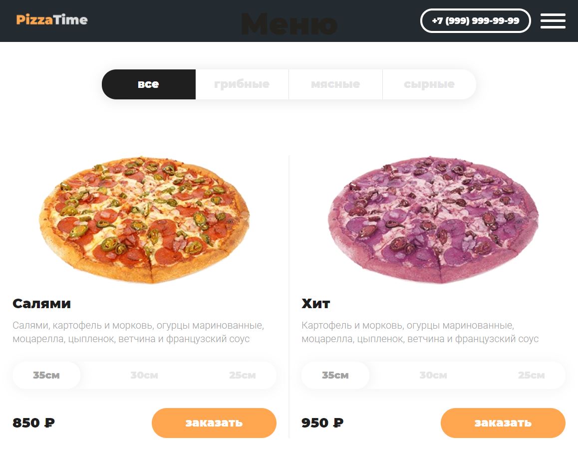 [list=1][*][h3]Адаптивное меню. Удобная навигация на всех устройствах.[/h3][*][h3]Кликабельный номер. Кликабельный номер значительно повышает конверсию и уменьшает процент отказов.[/h3][*][h3]Иконки соц сетей. Ваши социальные сети будут представлены на сайте.[/h3][/list][h3][url=https://nelazsky.github.io/PizzaTime/][u]PizzaTime.io[/u][/url][/h3]