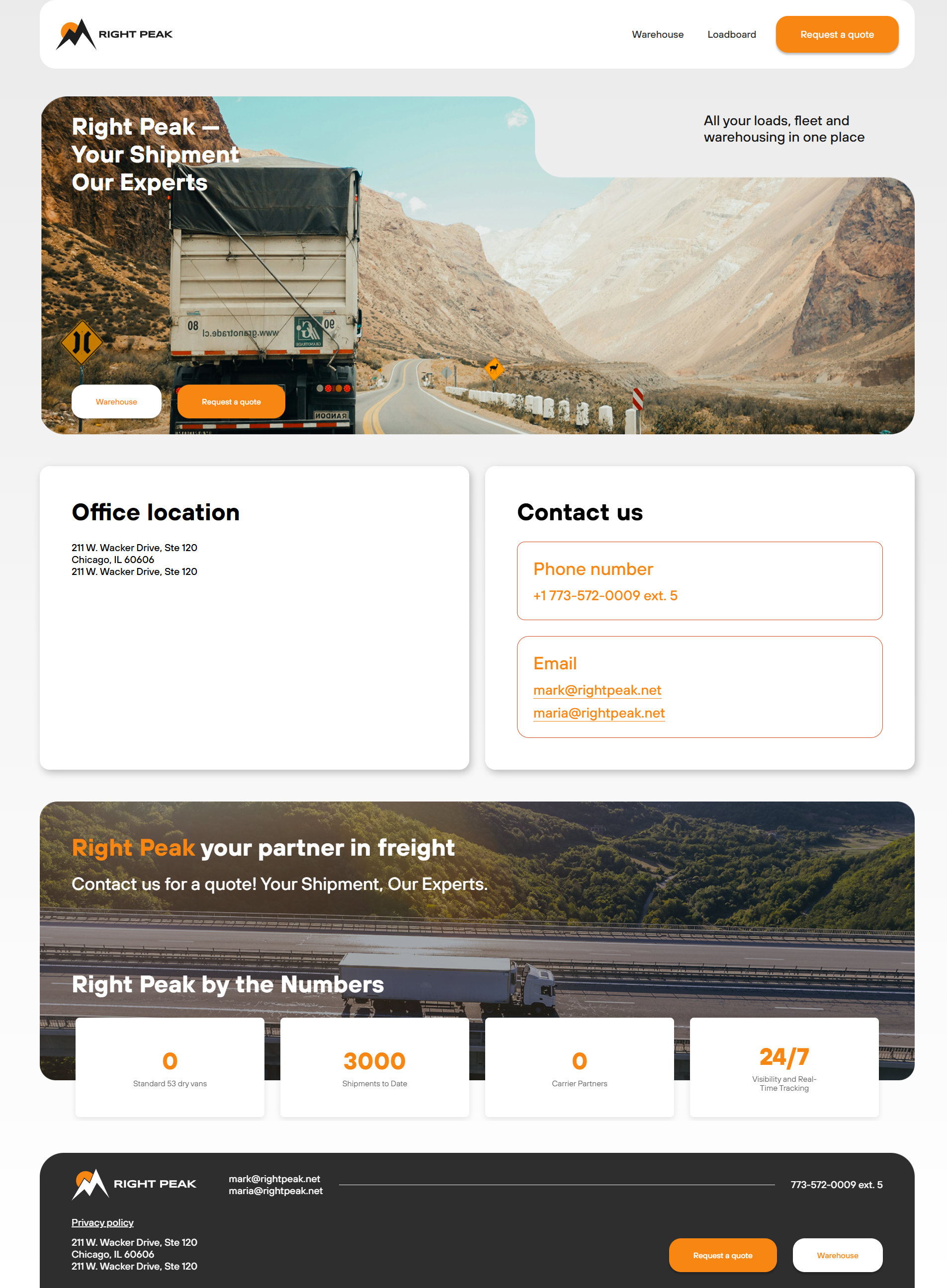Разработан полноценный веб-сервис для логистической компании RIGHT PEAK, включающий лоадборд активных грузов, интерактивную карту маршрутов и инструменты для расчёта складской площади. Платформа автоматизирует ключевые процессы логистического брокера — от публикации грузов до планирования маршрутов и оценки кросс-докинговых зон.
