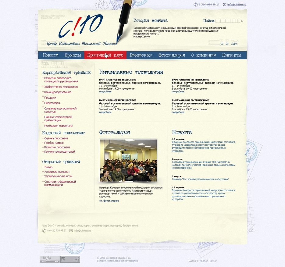 http://citotrn.ru/ Корпоративный сайт компании, занимающейся тренингами по лидерству и грантовыми программами Потанина