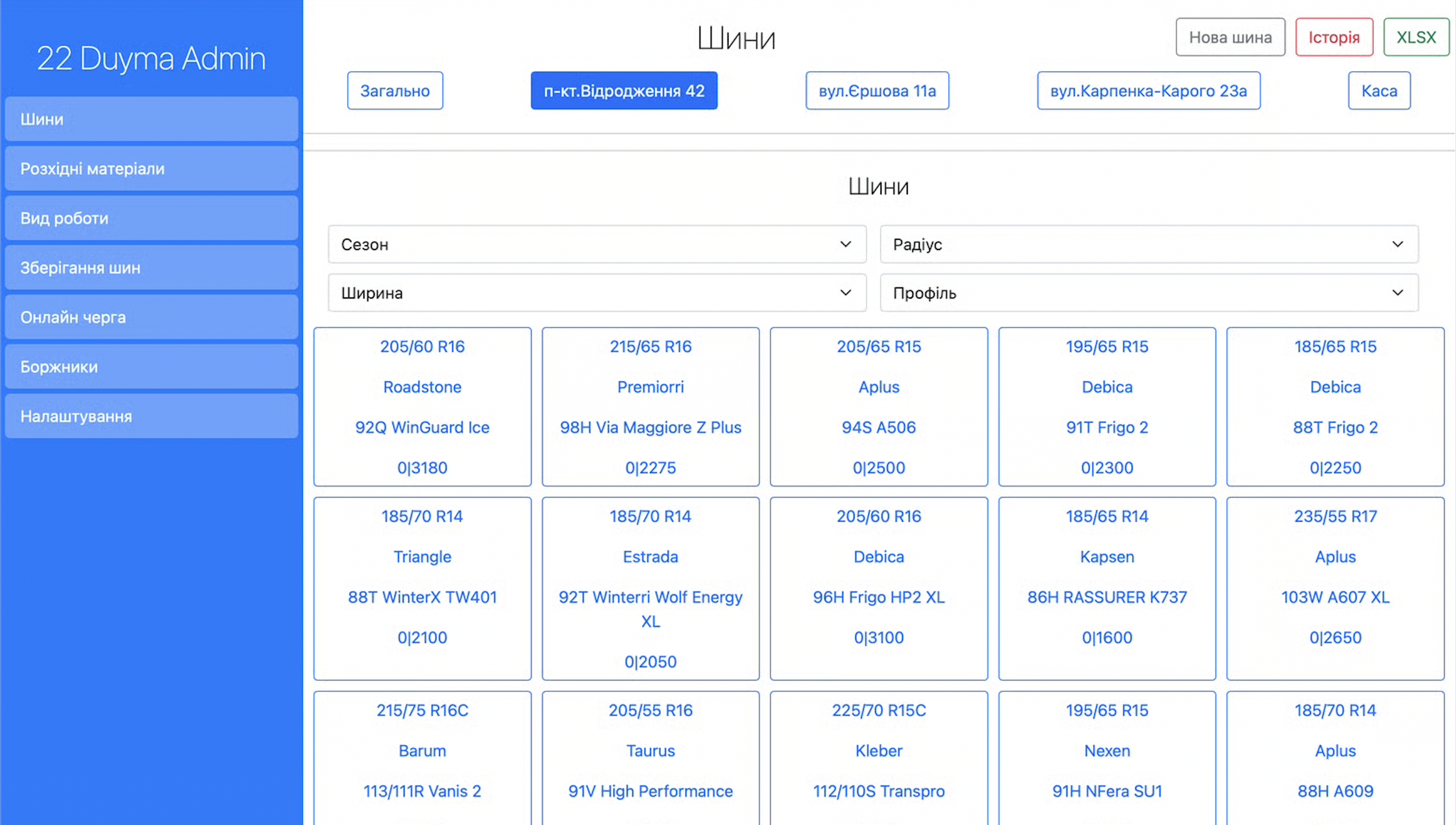 - управління зберіганням шин;