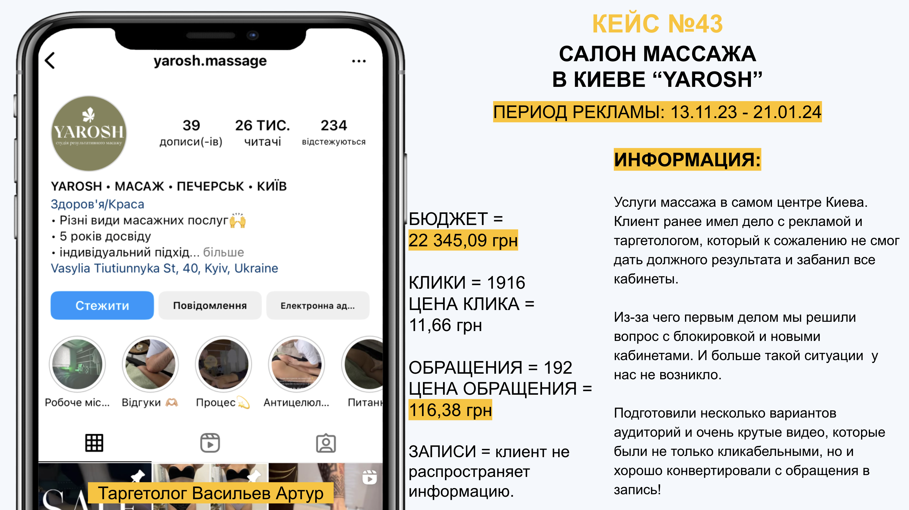 Услуги массажа в самом центре Киева. Клиент ранее имел дело с рекламой и таргетологом, который к сожалению не смог дать должного результата и забанил все кабинеты.