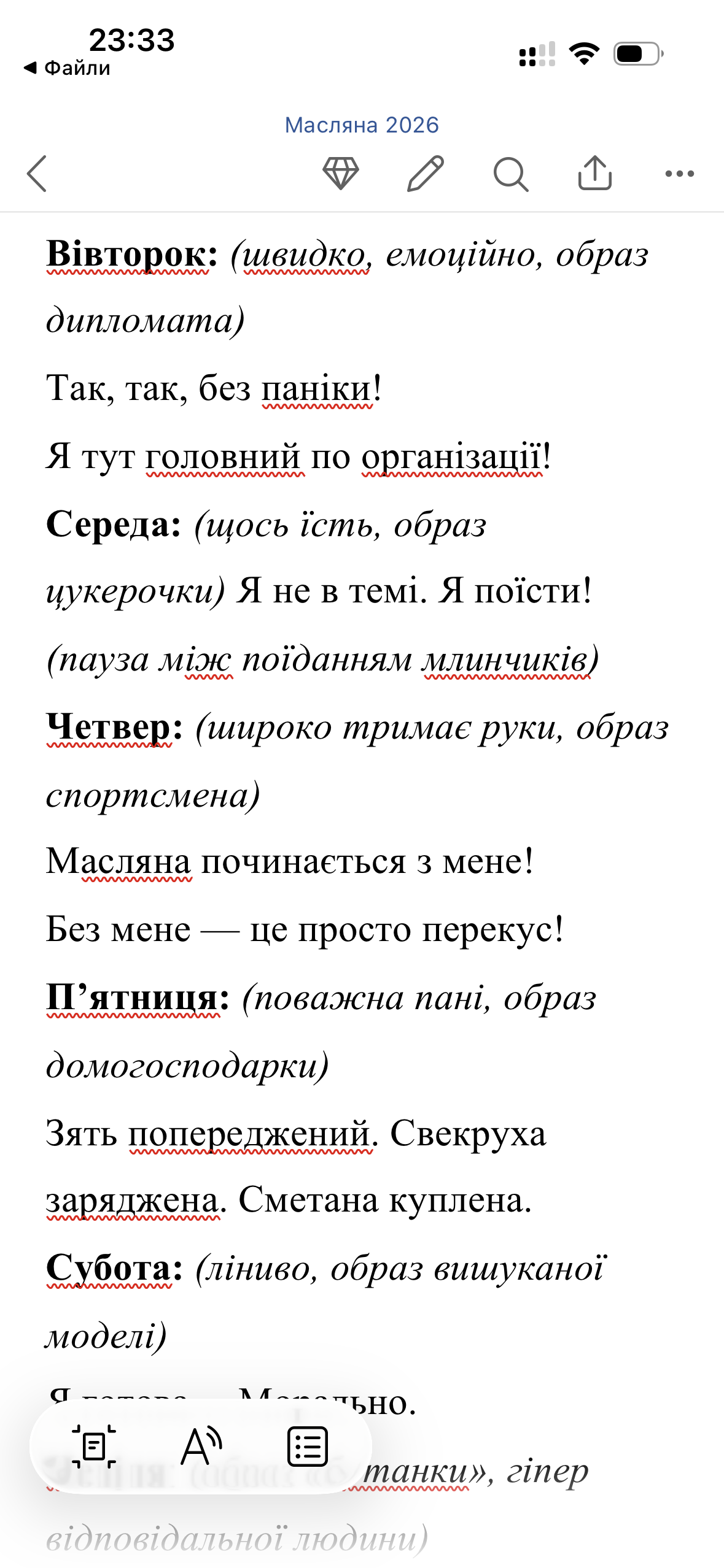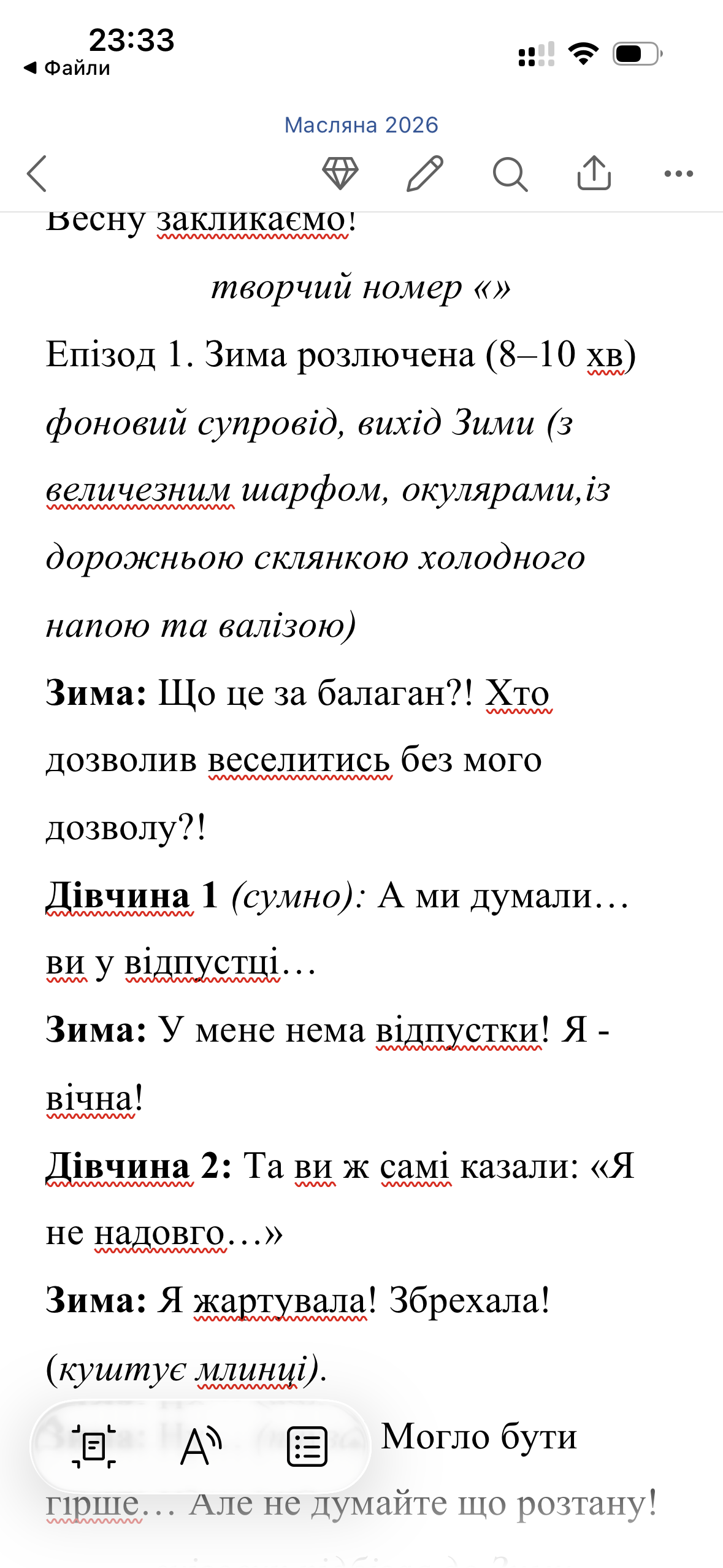 Авторський театралізований сценарій для міського або клубного формату з поєднанням драматургії, вокальних, танцювальних та інтерактивних номерів. Сюжет побудований навколо традицій Масляної, протистояння Зими та Весни й комедійної інтриги зі «зниклим» Понеділком.