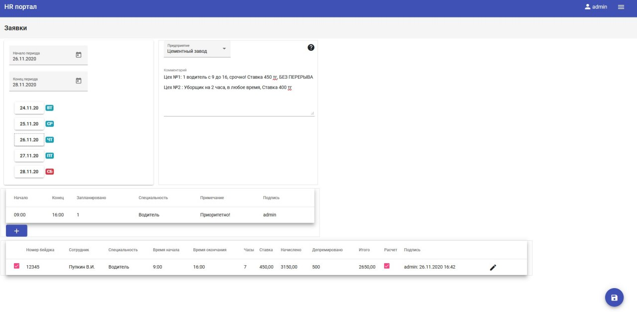 Приложение предназначено для контроля над трудовым временем сотрудников, назначением их на работы отдельных предприятий по заявкам от директоров, расчет заработной платы.
