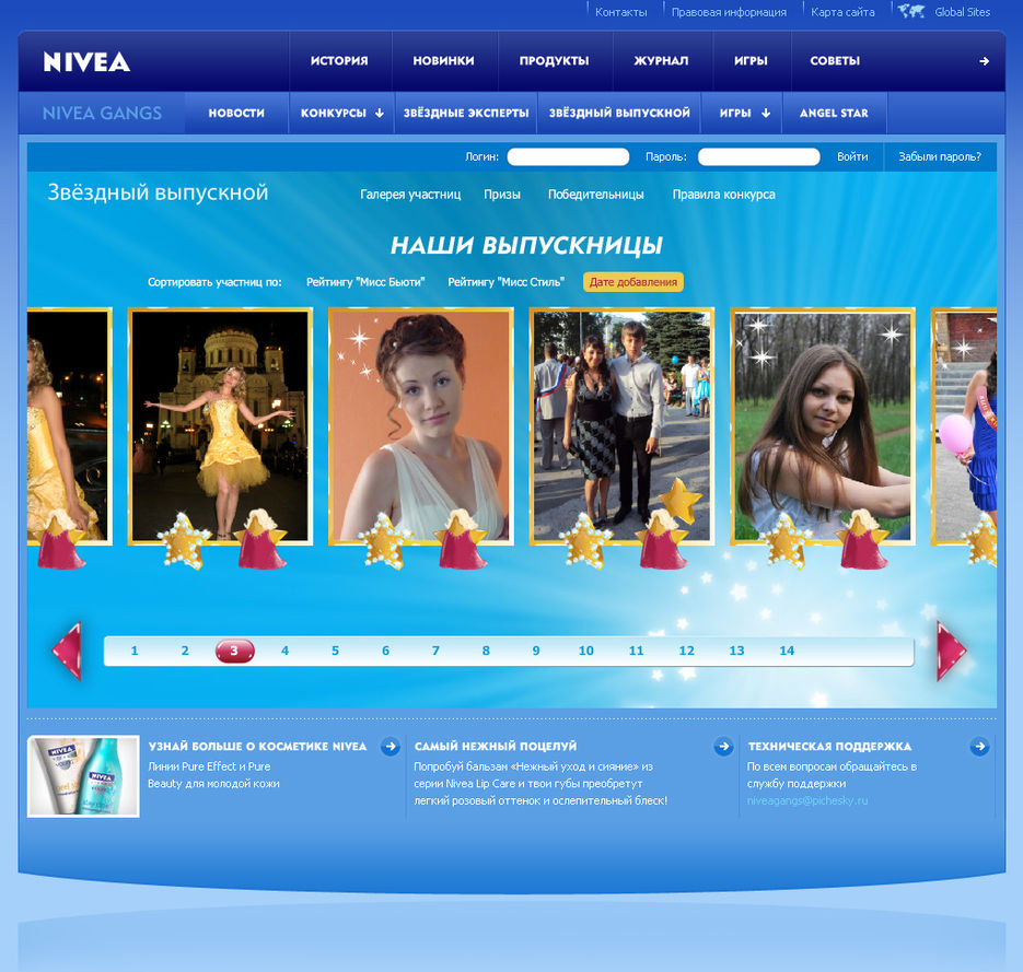 http://ext7.nivea.ru/_new/contest/stars Разработка клиентской части конкурса для социальной сети косметического бренда "Nivea"